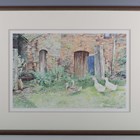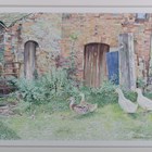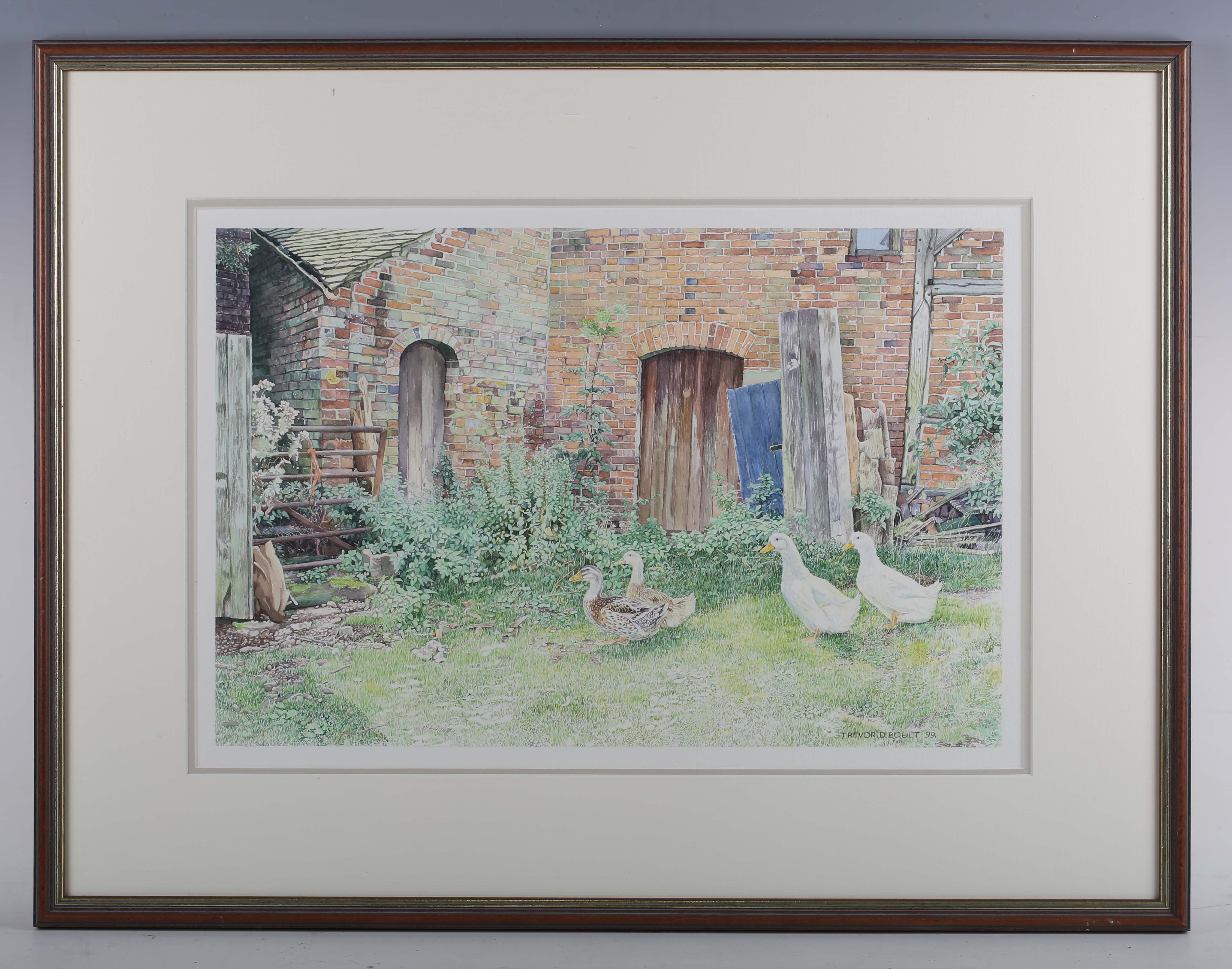 Trevor D. Boult (British late 20th century) - Ducks and geese in a farmyard, watercolour, signed and dated ’99 lower right, 33cm x 50.5cm, within a stained wood frame.