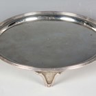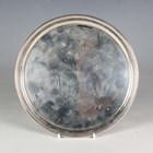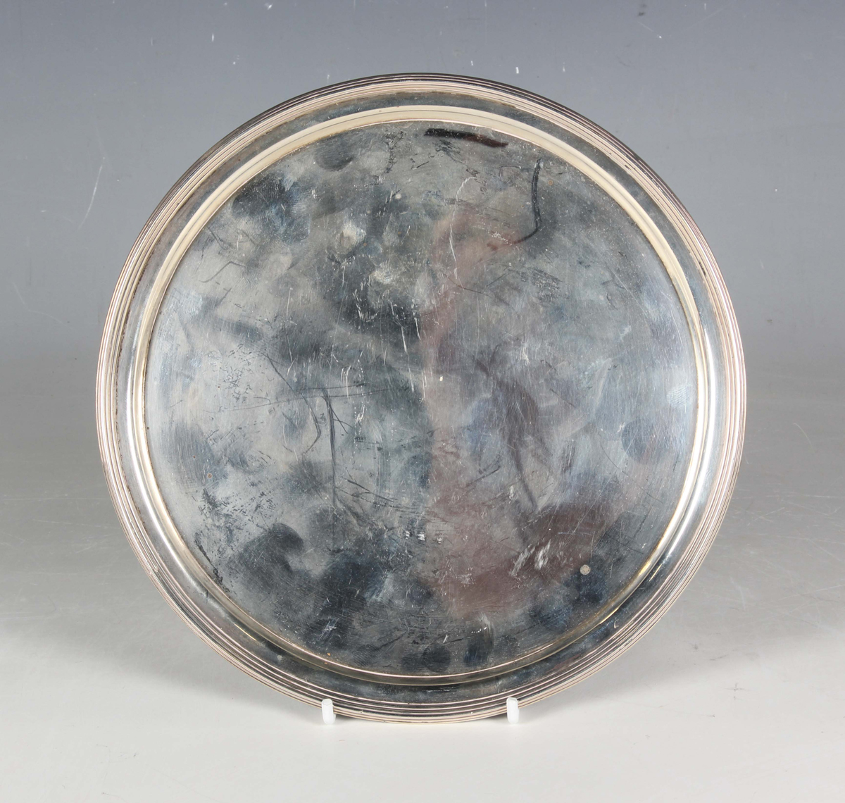 A George III silver circular card salver with raised reeded rim, on reeded scroll legs, London 1800 by William Allen III, weight 444.8g, diameter 20cm.