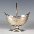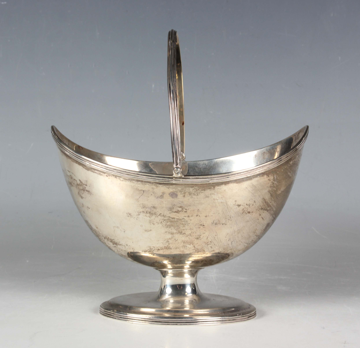A George III silver sugar basket of oval form with reeded swing handle above a similarly decorated rim and oval foot, London 1809 by Henry Chawner, weight 220.4g, total height 17.5cm.