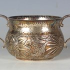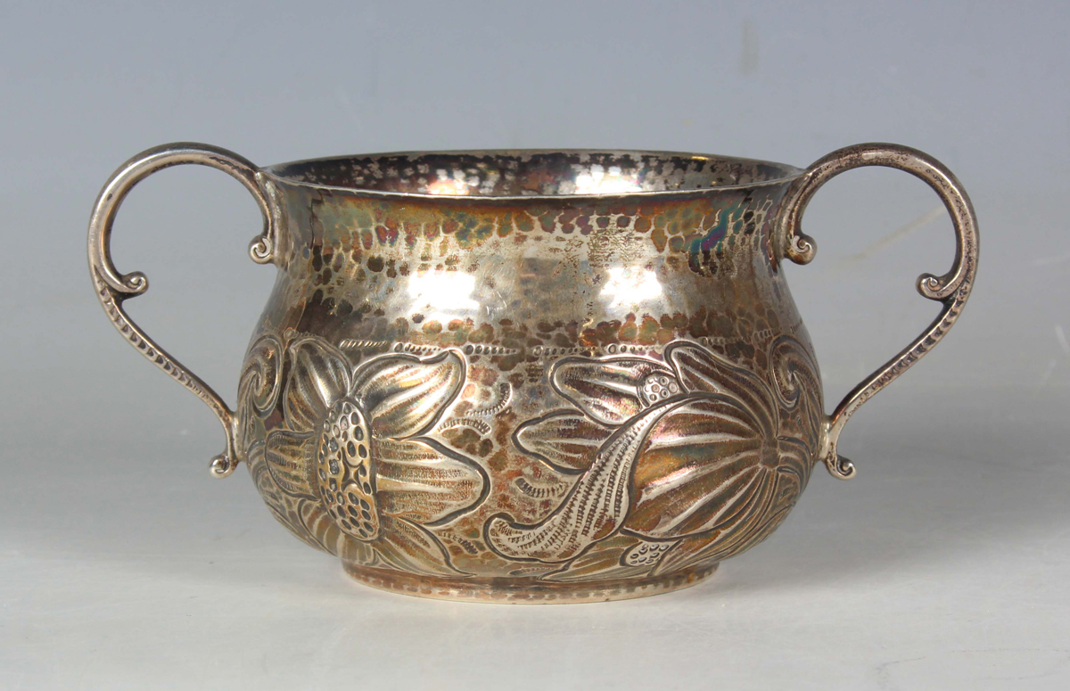 A George V silver two-handled porringer of low-bellied circular form, chased with a band of stylized flowers against a hammered ground, flanked by two scroll handles, London 1912 by Vander & Hedges, the base detailed 'Tessier London', weight 161.4g, length 12.5cm, height 6cm.