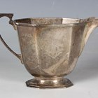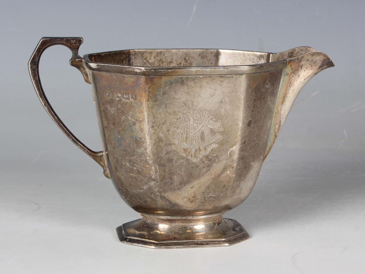 A George V silver octagonal milk jug, monogram engraved, with a faceted handle, on a canted corner rectangular foot, Sheffield 1935 by Frank Cobb & Co Ltd, weight 185.1g, height 9.7cm.