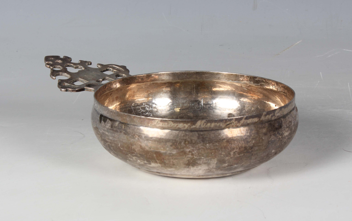 A late Victorian Britannia standard silver circular bowl with hammered decoration and engraved inscription, flanked by a pierced tab handle, London 1897 by Sibray, Hall & Co Ltd, weight 232.4g, length 19.5cm.