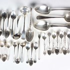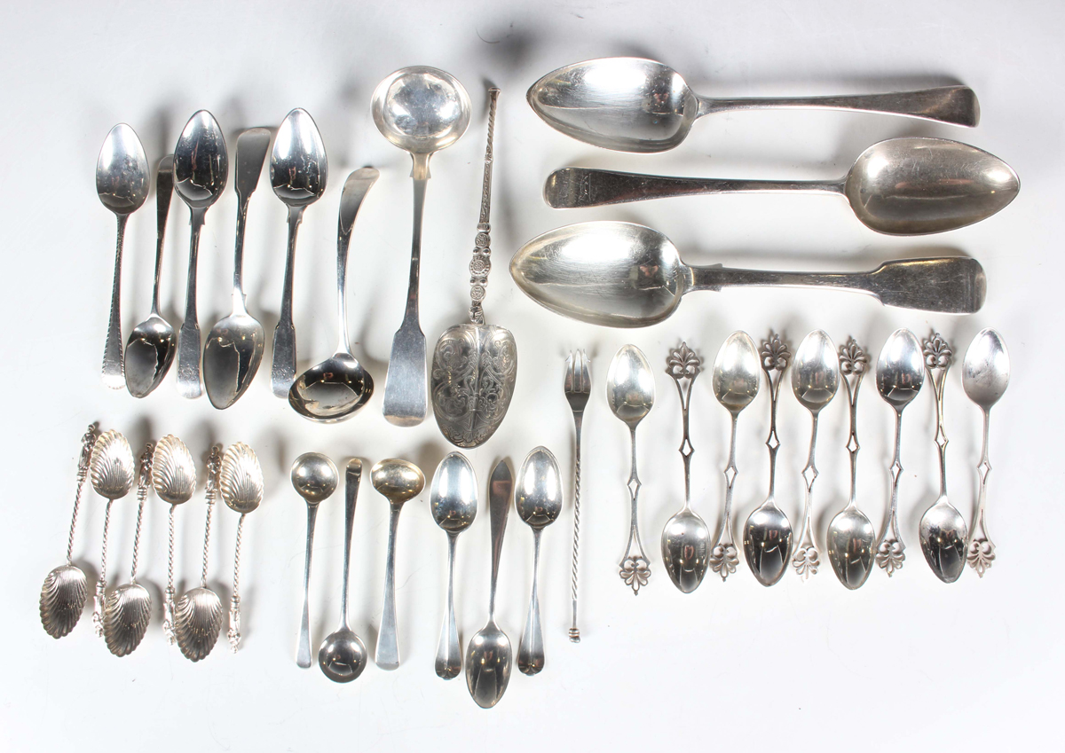 An early Victorian Scottish silver Fiddle pattern sauce ladle, Glasgow 1840 by David McDonald, length 17cm, and a group of other silver cutlery, including two Old English pattern tablespoons, a Fiddle pattern tablespoon, Exeter 1847 by Henry Ellis & Son, and various teaspoons, total weight 606g.