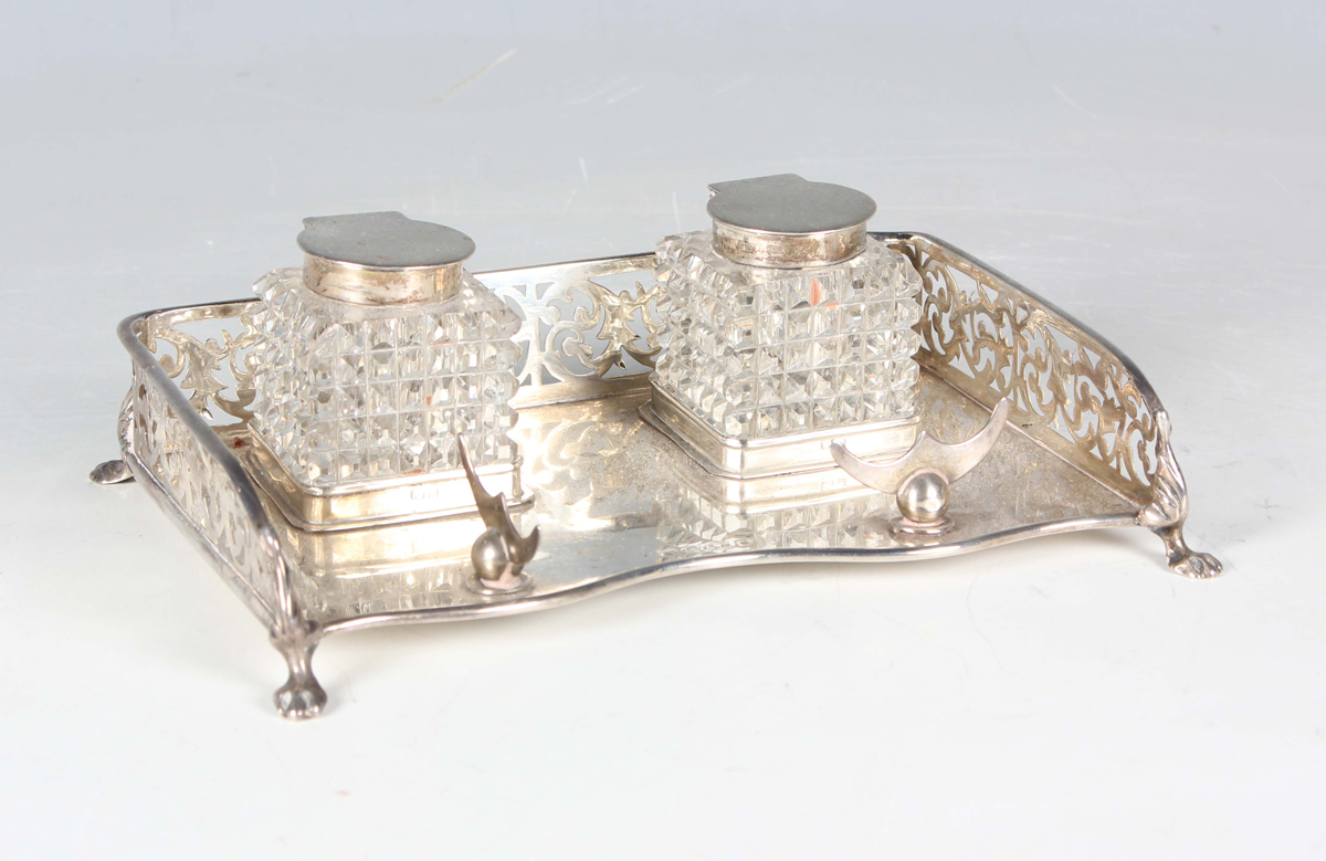 An Edwardian silver rectangular inkstand, fitted with two square cut glass inkwells with silver collars and hinged lids, the stand with serpentine front and pierced three-quarter gallery back, on paw feet, Birmingham 1903 by Samuel M. Levi, weight of stand 217.6g, length 17.8cm.