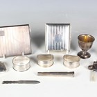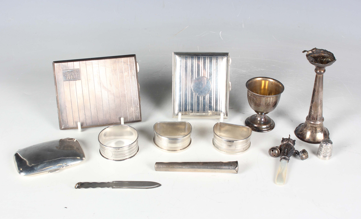 A small group of silver, including a curved rectangular cigarette case, Chester 1929, length 10.3cm, two other cigarette cases, a cheroot holder and a child's rattle in the form of an owl, fitted with two bells and a mother-of-pearl teething handle, height 8.3cm, total weight 392.2g.