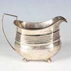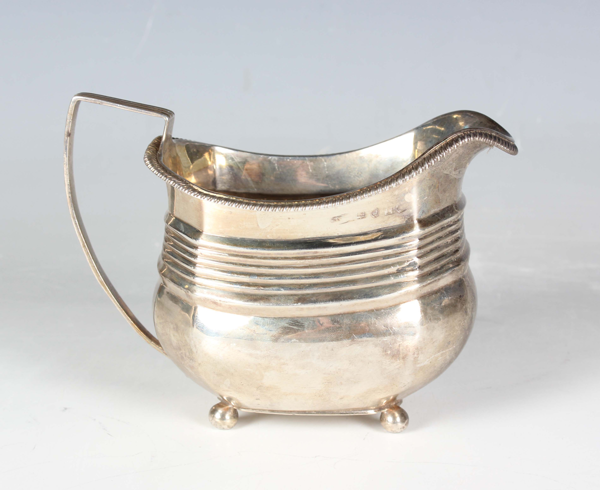 A George III silver milk jug of cushion form with horizontal reeded decoration, on ball feet, London 1814, maker's mark worn, weight 141.5g, height 10cm.