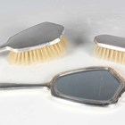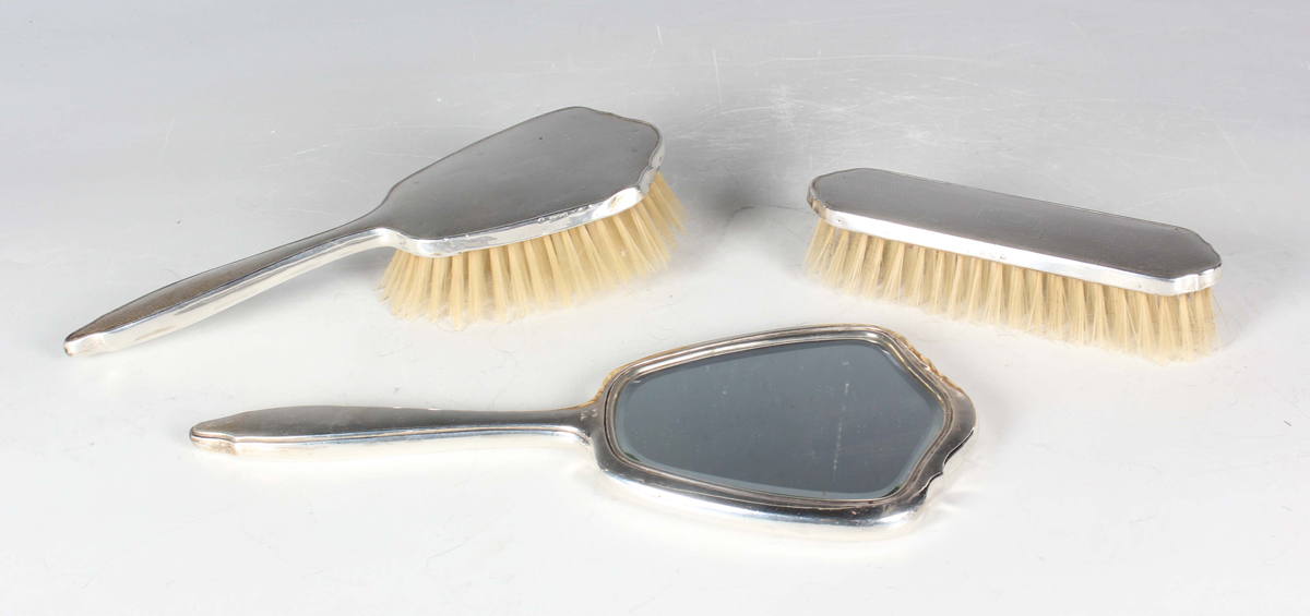 An Elizabeth II silver mounted three-piece dressing table set with engine turned decoration, comprising hand mirror, hairbrush and clothes brush, Birmingham 1957 and 1959 by Adie Brothers Ltd.