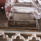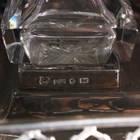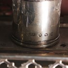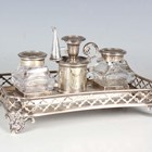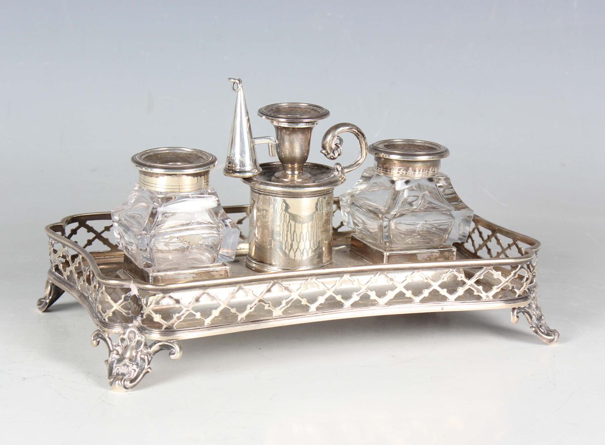 An early Victorian silver inkstand, the stand of rectangular form with lobed corners and pierced gallery, raised on cast scroll feet, fitted with two square cut glass inkwells with silver collars and covers, flanking a cylindrical box with taperstick holder cover, Sheffield 1843 by Henry Wilkinson & Co, weight excluding glass wells 386.1g, length 20cm.