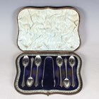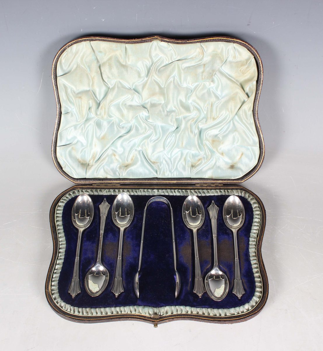 A set of six late Victorian silver Albany pattern teaspoons and pair of matching sugar tongs, London 1897 by Robert Stebbings, total weight 121.5g, cased.
