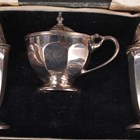 An Elizabeth II silver three-piece condiment set of cushion form with gadrooned rim, on scroll legs, comprising mustard, salt and pepper caster, Birmingham 1961 by Adie Brothers Ltd, and a group of other silver condiments, total weight 436g, together with two .830 silver pepper casters, weight 15g.