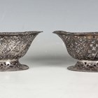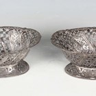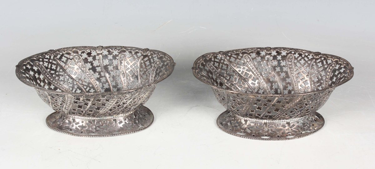 A pair of late Victorian silver oval bonbon dishes, each with pierced and beaded sides above a similarly decorated oval foot, London 1890 by Martin Hall & Co, total weight 326.6g, length 16cm.