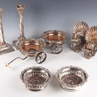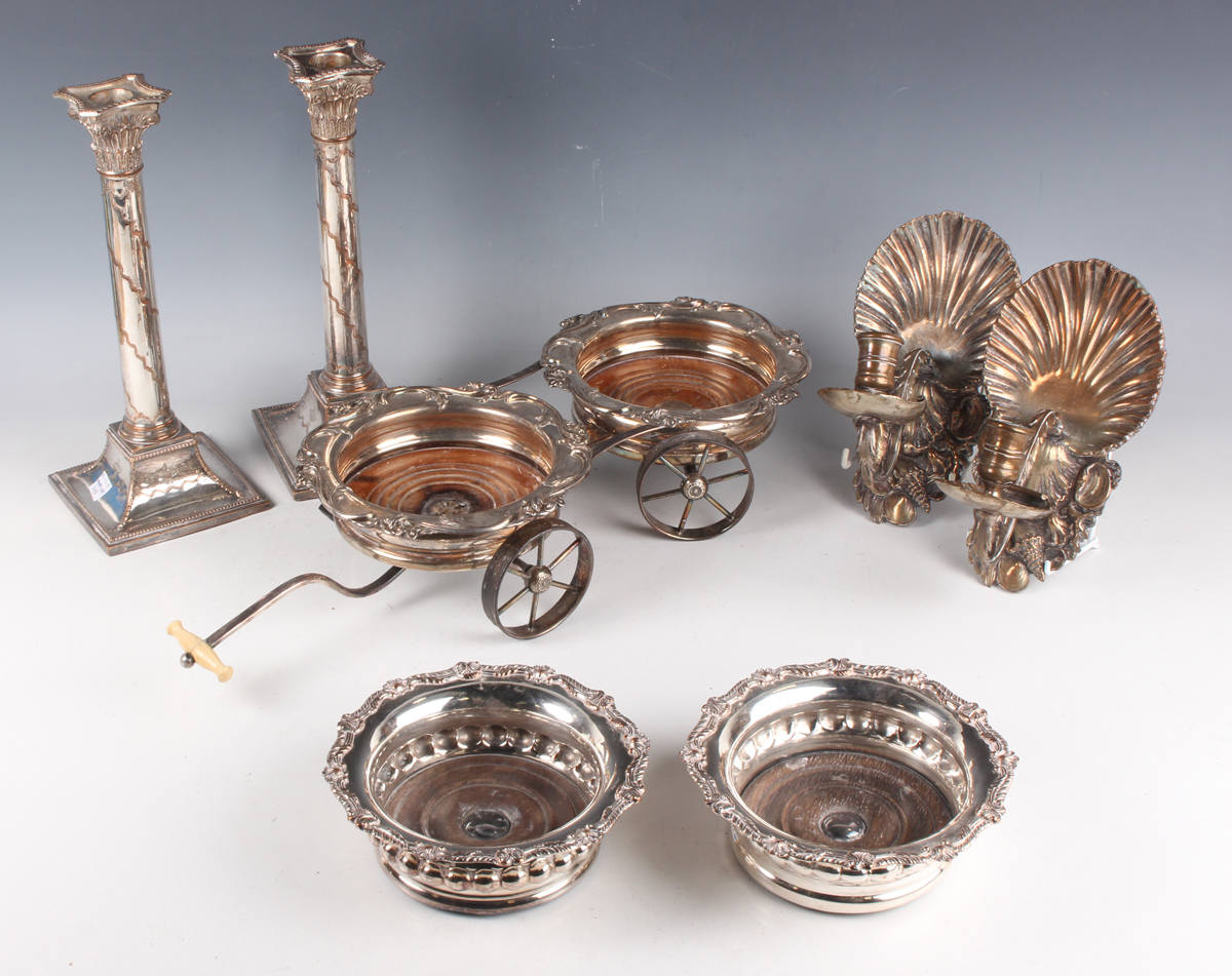 An early Victorian Sheffield plate wine trolley, each circular coaster cast with foliate rims supported by four rotating six-spoke wheels, total length 48cm, a pair of George III Sheffield plate Corinthian column candlesticks, each with a detachable nozzle, on square beaded bases, height 28cm, a pair of Sheffield plate wine coasters and a pair of plated on copper single-light girandoles, each cast with scallop shell backs above a cluster of seashells, weight 20.5cm.
