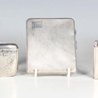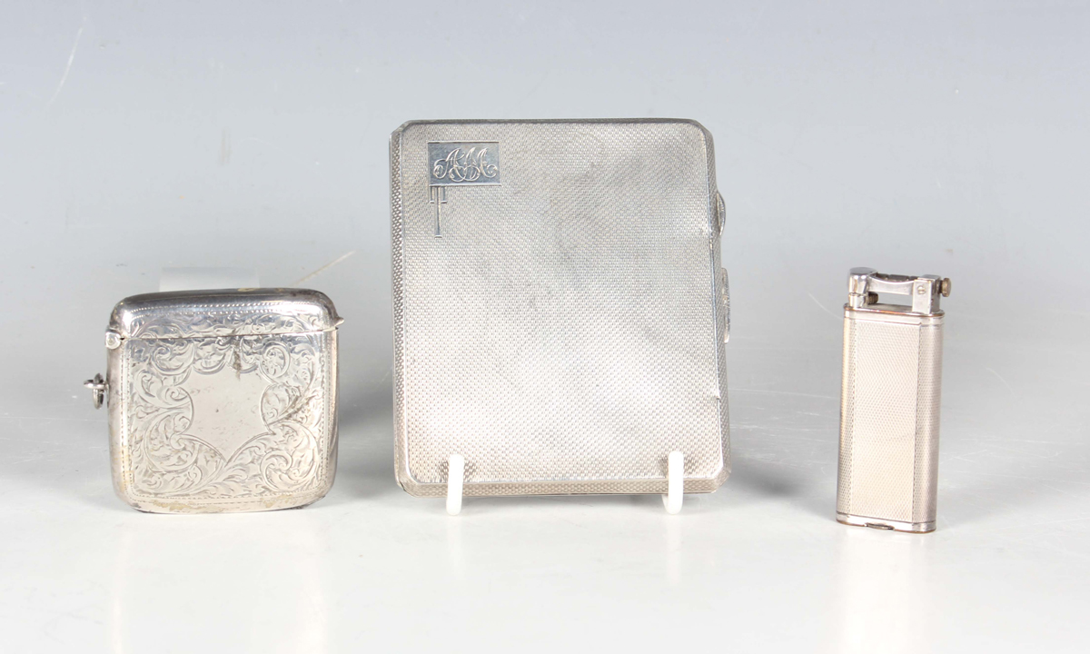 A George IV silver vesta case with engraved decoration, Birmingham 1921, a silver rectangular cigarette case with engine turned decoration, Birmingham 1939, total weight 160.7g, and a plated Dunhill petrol lighter, height 6.1cm.