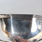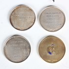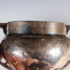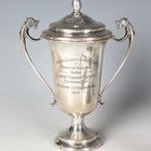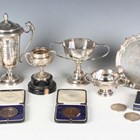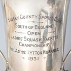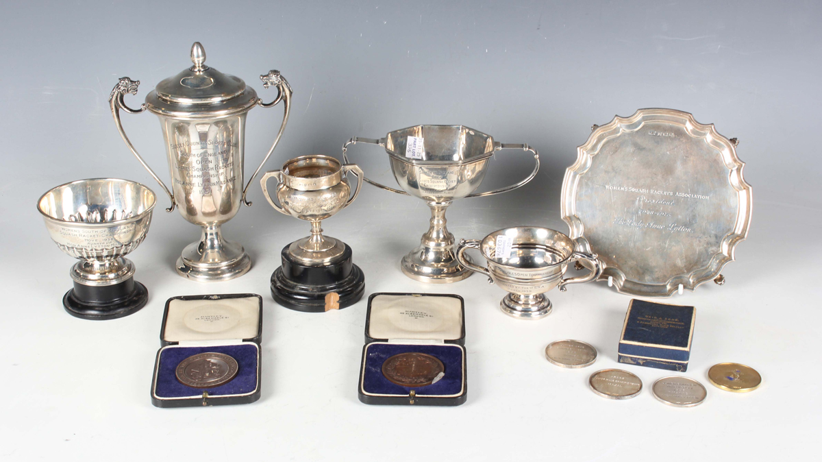 A George V silver trophy cup and domed cover of tapering cylindrical form flanked by two scroll and lion mask handles, presentation engraved 'Sussex Squash Rackets Championship Hon. Anne Lytton Milbanke 1931', on a circular foot, Birmingham 1928 by Joseph Gloster Ltd, height 20cm, four other silver trophy cups and a silver card salver, all presentation engraved, and four silver medals, total weight 917.7g, together with two bronze medals, each cased.