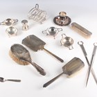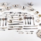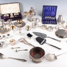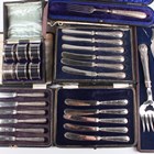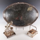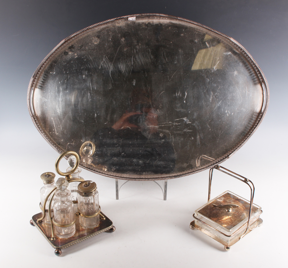 A group of plated items, including a four-bottle cruet stand of square form, fitted with four cut glass bottles, a glass sardine dish with plated stand and cover, various condiments, two sets of six silver handled butter knives and a set of five silver handled butter knives, cased, two meat skewers, three tea strainers and stands and an oval galleried tray.