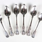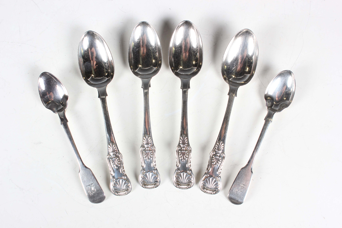 A set of four early Victorian silver King's pattern teaspoons, Newcastle 1845, and a pair of silver Fiddle pattern coffee spoons, London 1838, total weight 116.5g.
