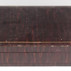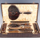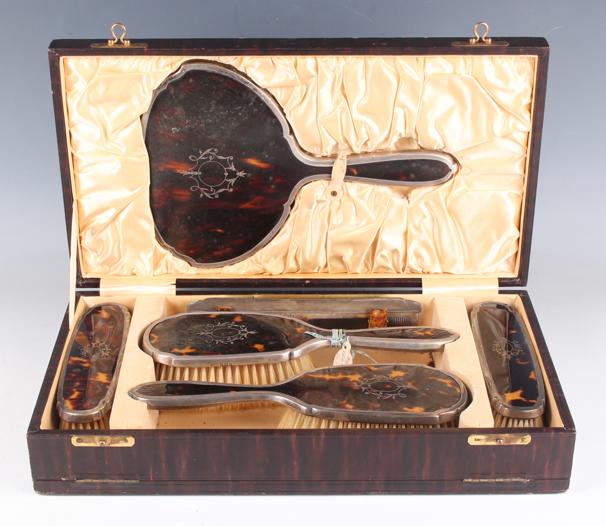 A George V silver and tortoiseshell six-piece dressing table set, piqué inlaid with foliate pendants, Birmingham 1927 and 1928 by Daniel Manufacturing Company, cased.