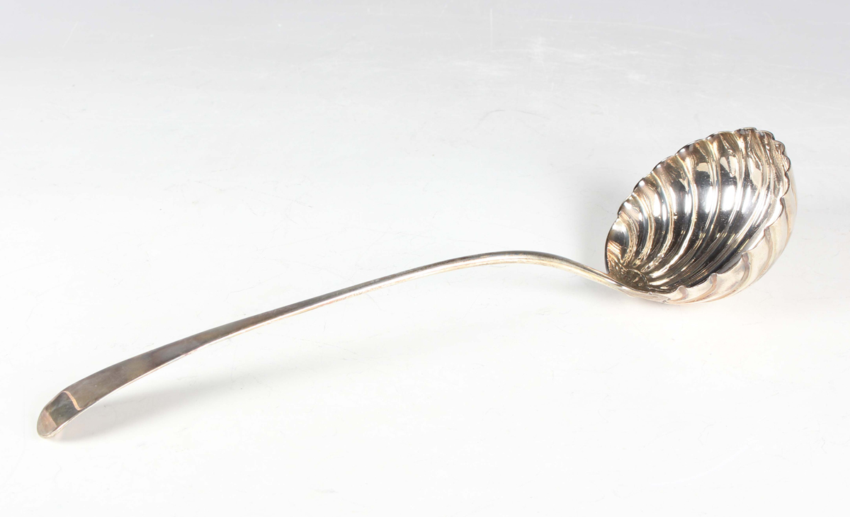 A George III silver Old English pattern soup ladle with scallop shell bowl, London 1784 by Richard Crossley, with incuse duty mark, weight 146.5g, length 31.5cm.