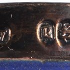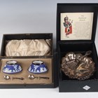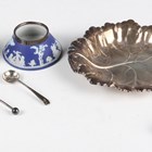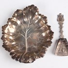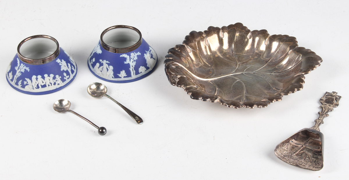 An Elizabeth II silver leaf shaped dish, Birmingham 1970 by Barker Ellis Silver Co, weight 76.8g, length 14.4cm, a pair of silver collared Wedgwood blue jasperware tapering circular salts, London 1910 by Richard Owen Williams, diameter 6.6cm, cased, a silver salt spoon, a plated salt spoon and a Dutch plated caddy shovel, decorated with a windmill, length 10.8cm.