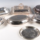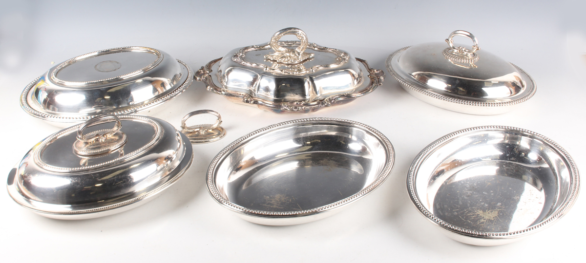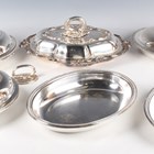 A group of entrées dishes, covers and handles, including one with rococo scroll borders, and a muffin dish, cover and liner.