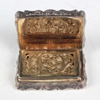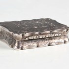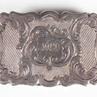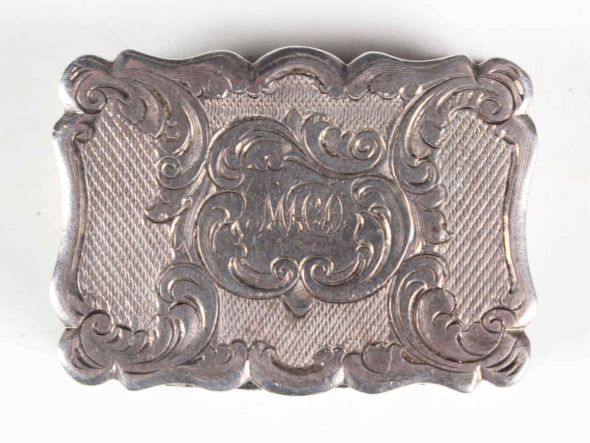 A Victorian silver vinaigrette of shaped rectangular form with engraved decoration, the hinged lid revealing a pierced and engraved gilt hinged grille, Birmingham 1854 by Frederick Marson, weight 18.5cm, length 3.7cm.