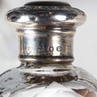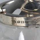 A George V silver mounted clear glass preserve jar and cover with swing handle, the body intaglio cut with stylized flowers and leaves, Birmingham 1913 by W. Coulthard Ltd, total height 16cm, and a set of three silver lidded faceted cut glass dressing table bottles, each silver lid monogram and scroll engraved, weight of three lids 36.8g.