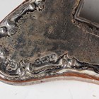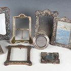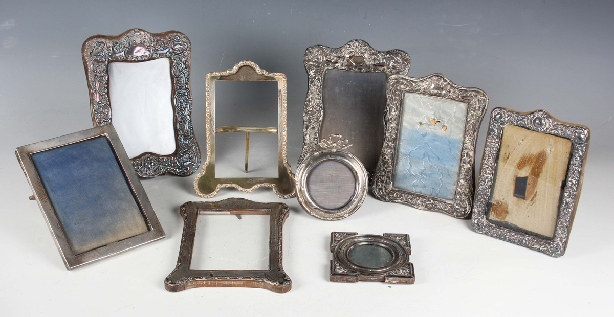 An Edwardian silver gilt shaped rectangular photograph frame with cast floral and 'C' scroll border, London 1905 by Goldsmiths & Silversmiths Co Ltd, weight 89.5g, height 18.5cm (lacking backing and glass), together with eight silver mounted photograph frames.