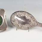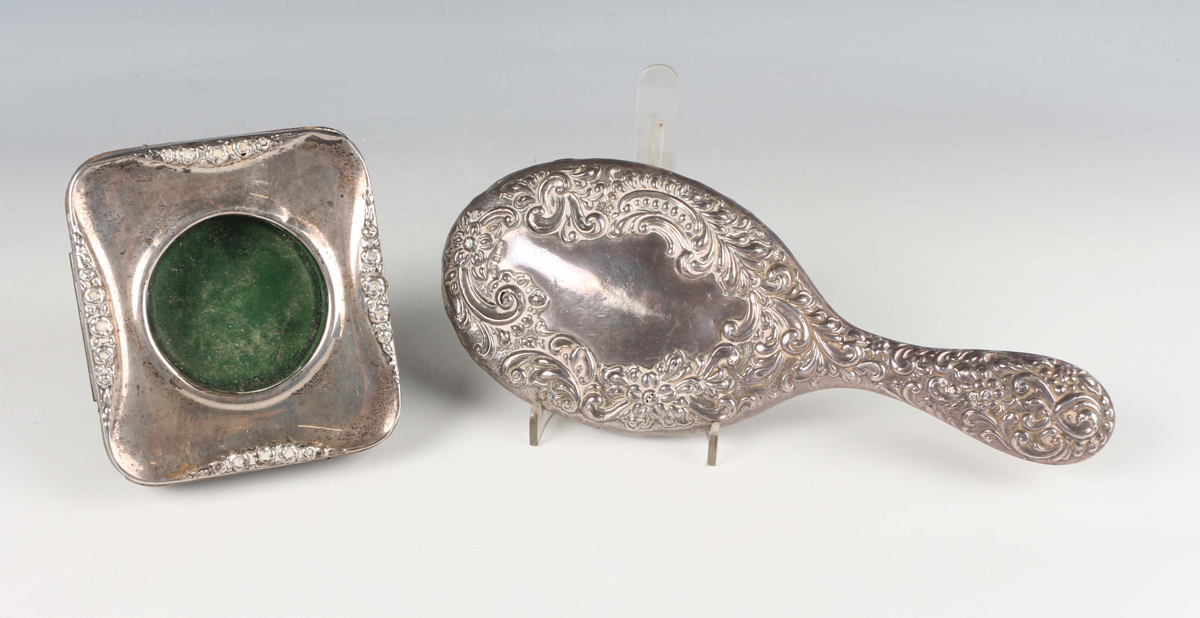 A George V silver mounted travelling watch case of square form with embossed floral decoration to each side, Birmingham 1910, height 12cm, and an Edwardian silver hand mirror with embossed decoration, Birmingham 1901.