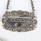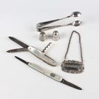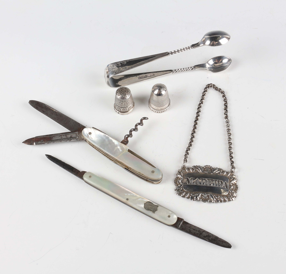A Victorian silver decanter label, pierced with 'Madeira' within a scallop shell and scroll border, London 1851 by Charles Reily & George Storer, width 4.7cm, a pair of silver sugar tongs with engraved decoration, Sheffield 1901, and two silver thimbles, total weight 42.7g, together with two mother-of-pearl mounted steel folding fruit knives.