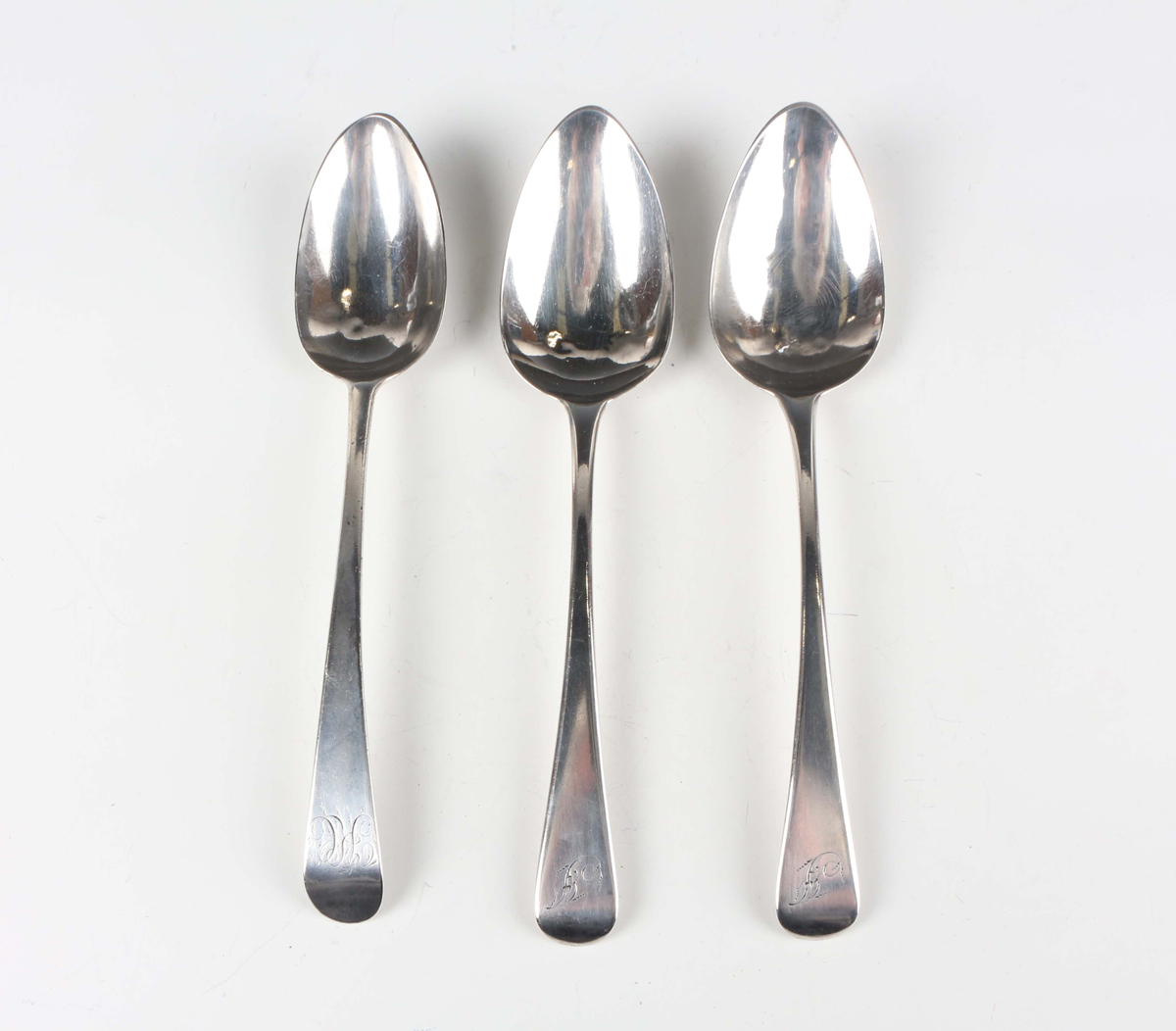 A George II silver Old English pattern tablespoon, London 1780 by William Cattell, length 21cm, and a pair of silver Old English pattern tablespoons, London 1810 by Richard Turner, length 21.3cm, total weight 153.5g.