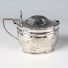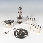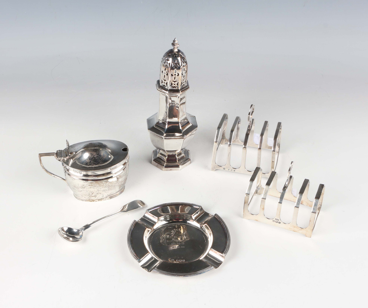 A late Victorian silver oval mustard, inscription engraved, London 1896 by Henry Stratford, together with two silver four-division toast racks, a silver octagonal baluster sugar caster, Birmingham 1911, and a silver ashtray, total weight 381g.