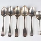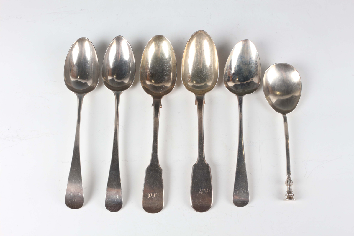 A pair of George III silver Old English pattern tablespoons, London 1790 by Samuel Godbehere & Edward Wigan, a Scottish silver Fiddle pattern tablespoon, Edinburgh 1841, another silver Fiddle pattern tablespoon, Exeter 1844, and two silver spoons, including a George V seal top spoon, Sheffield 1915 by William Hutton & Sons Ltd, total weight 380g.