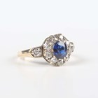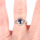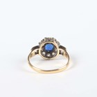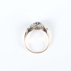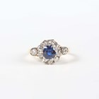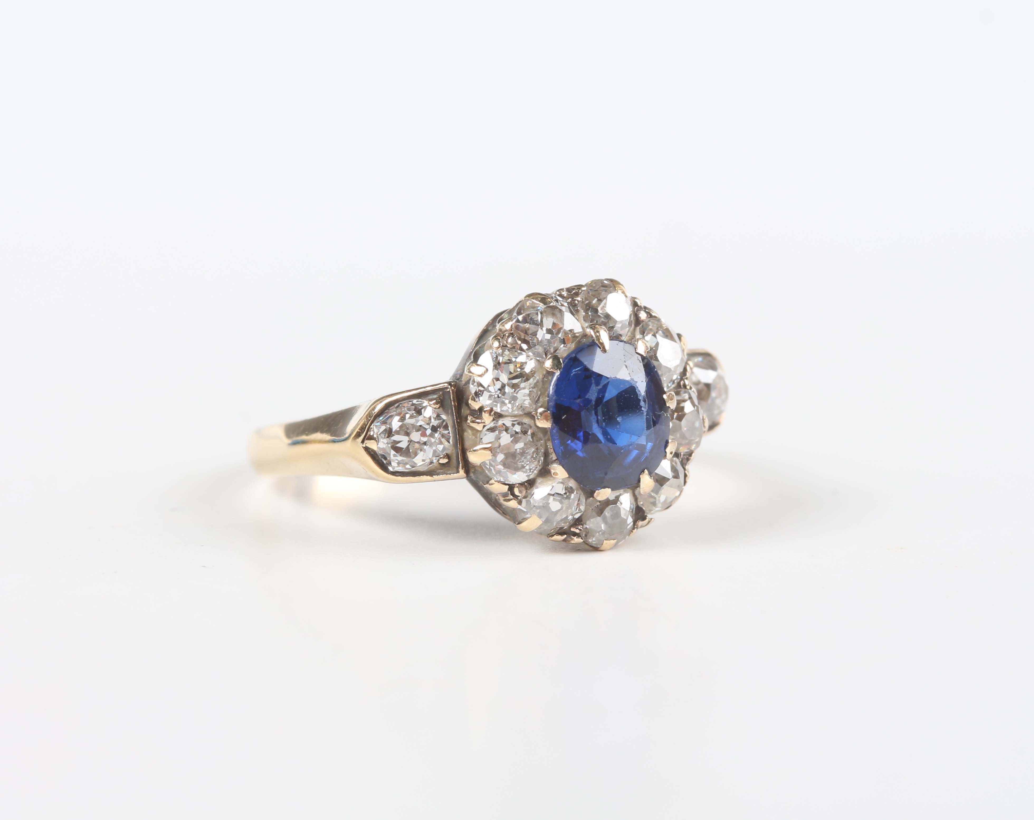 A gold, sapphire and diamond cluster ring, claw set with the cushion shaped sapphire within a surround of nine old cut cushion shaped diamonds, between diamond single stone shoulders, detailed '18ct', weight 3.1g, ring size approx L1/2.