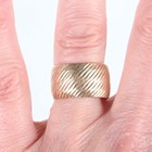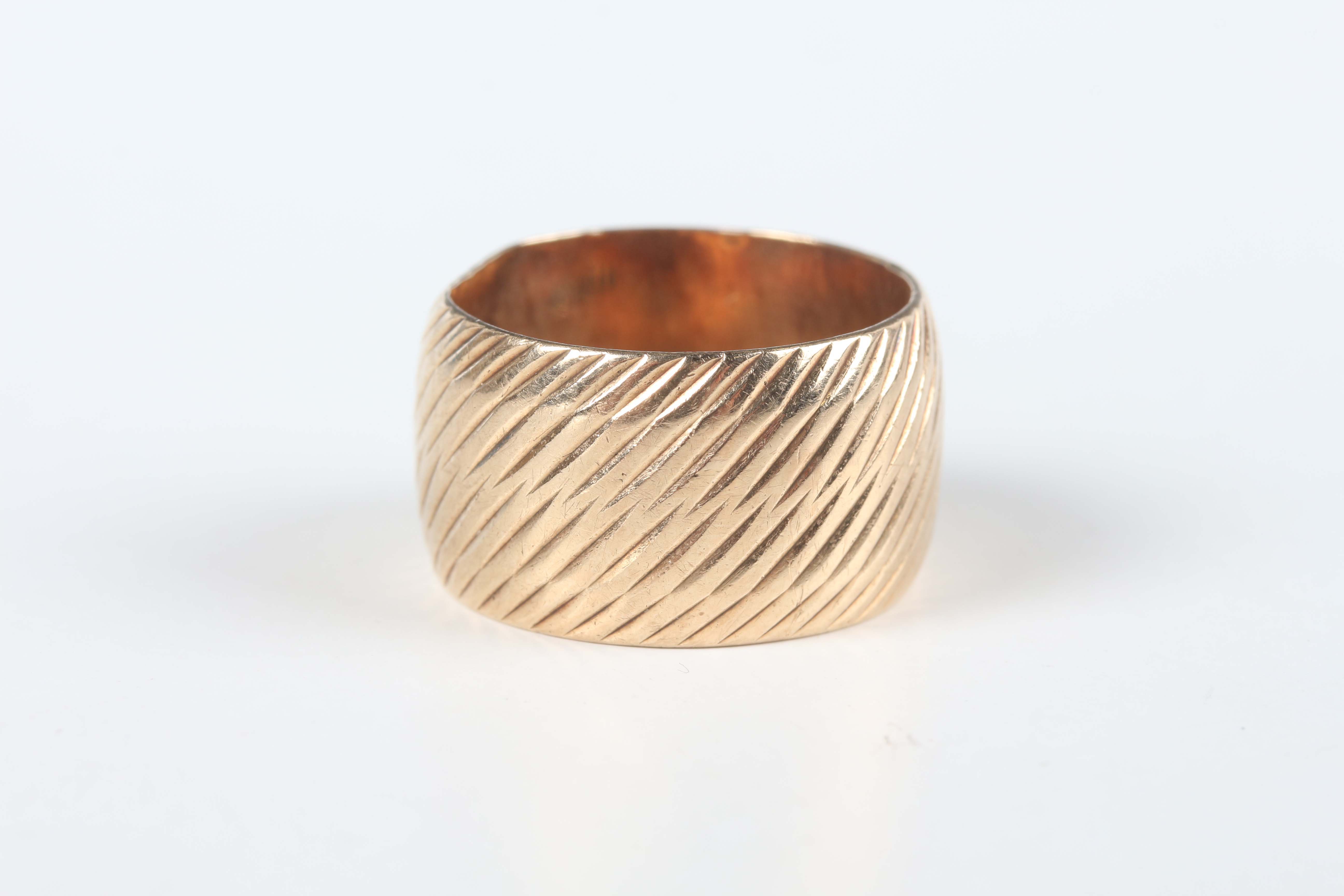 A 9ct gold wide band wedding ring, engraved with slanting decoration, London 1967, weight 8.9g, ring size approx N.