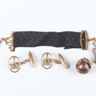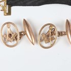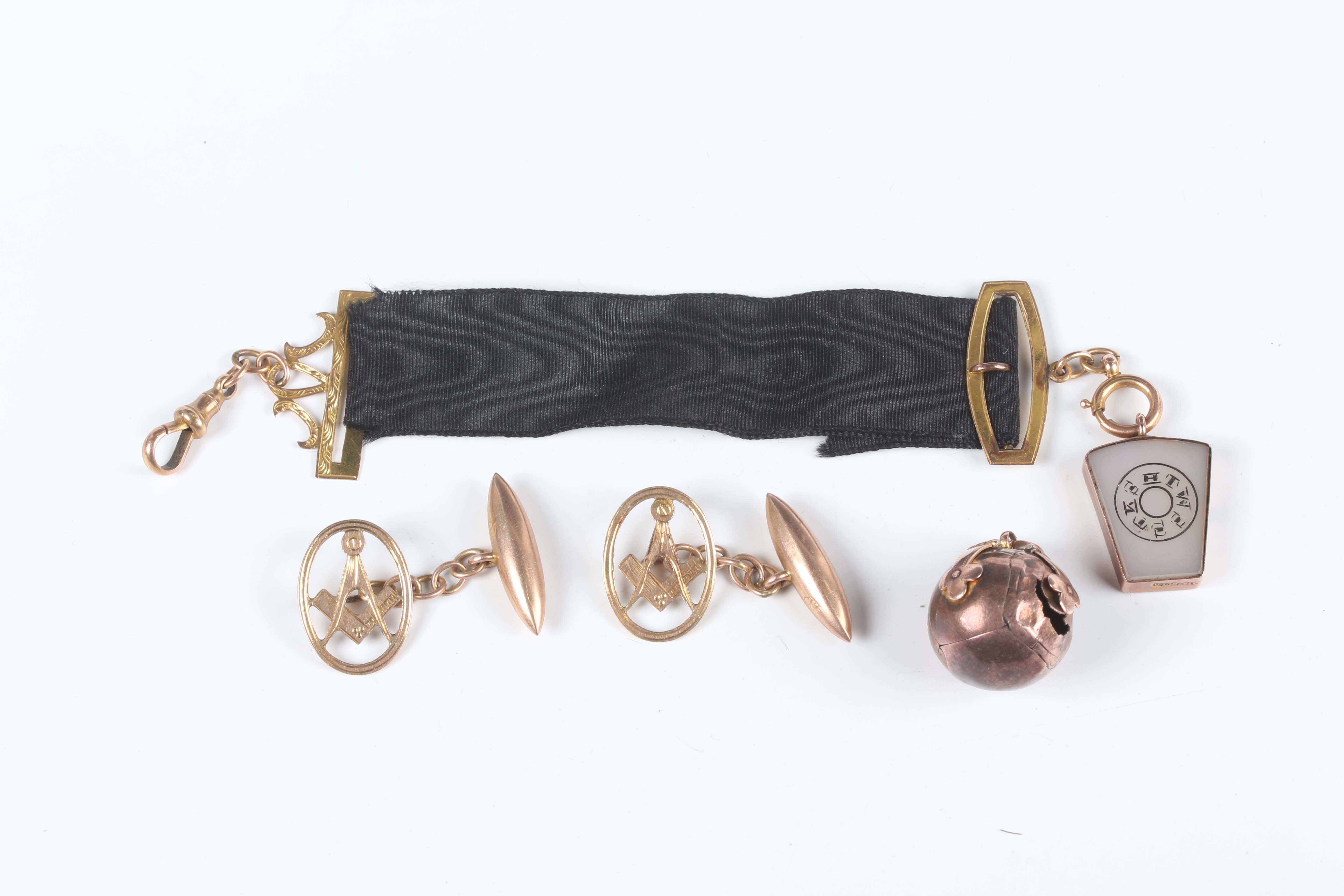 A pair of gold cufflinks, the fronts designed as Masonic squares and compasses, with torpedo shaped backs, detailed ‘9ct’, weight 4g, a Masonic spherical pendant fob, opening to reveal engraved Masonic symbols (damaged) and a gold mounted agate Masonic fob, detailed ‘9ct Gold’, fitted to a black ribbon with a swivel, detailed ‘9ct’.