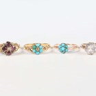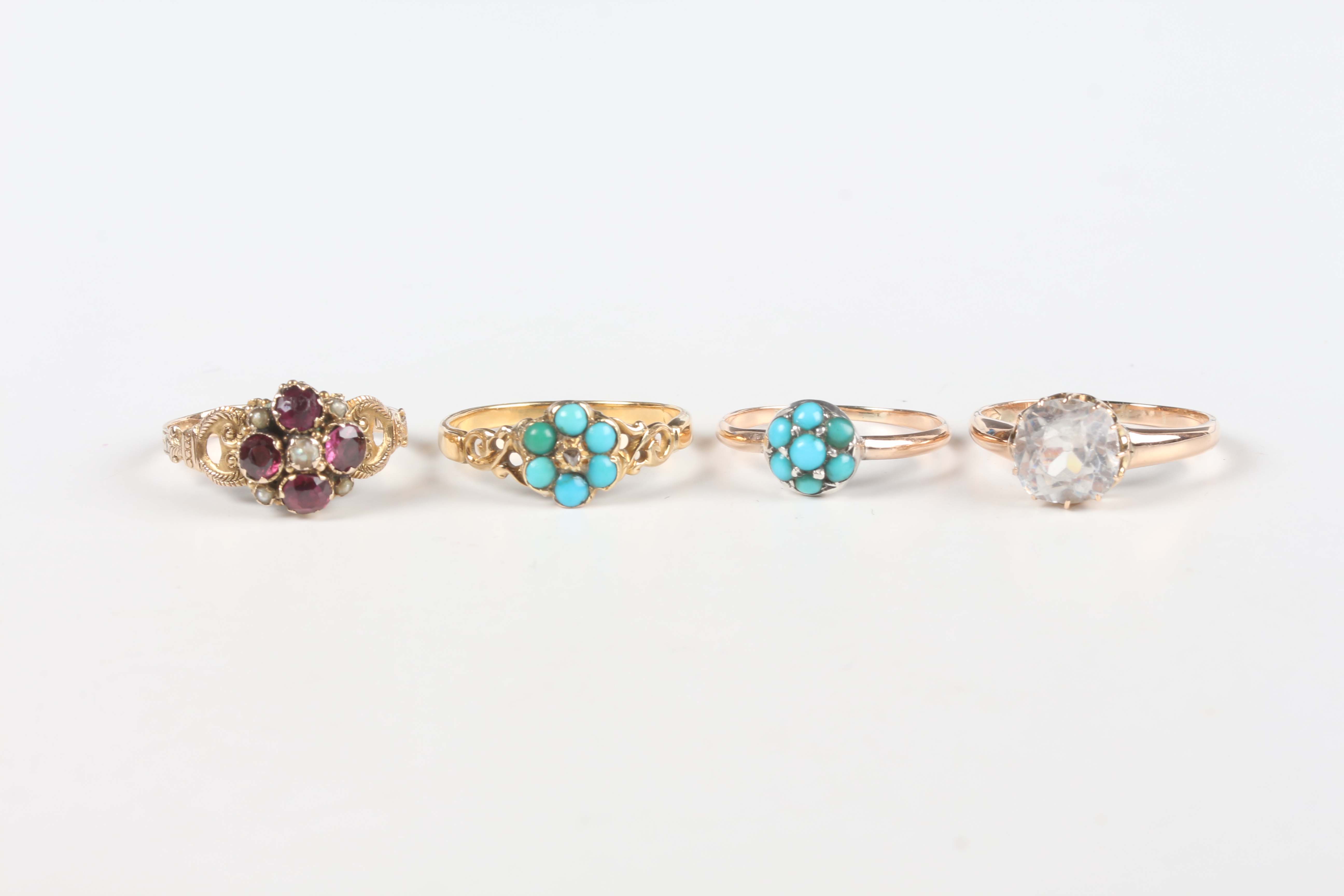 A Victorian gold, turquoise and rose cut diamond cluster ring with scroll pierced shoulders, unmarked, weight 2g, ring size approx O1/2, a Victorian 9ct gold, garnet and seed pearl cluster ring with a locket compartment, Birmingham 1873, ring size approx N1/2, a gold and colourless gem set solitaire ring, indistinct marks, ring size approx N, and a gold and silver set, turquoise cluster ring, unmarked, ring size approx M, total weight 5g.