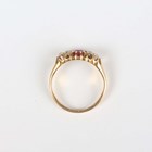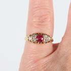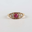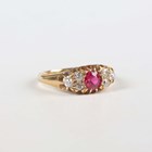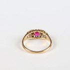 A gold, ruby and diamond ring, claw set with a cushion shaped ruby between cushion shaped diamond set three stone sides, indistinct marks, weight 2.8g, ring size approx J1/2.