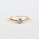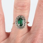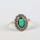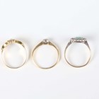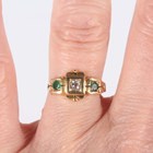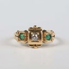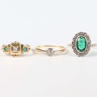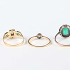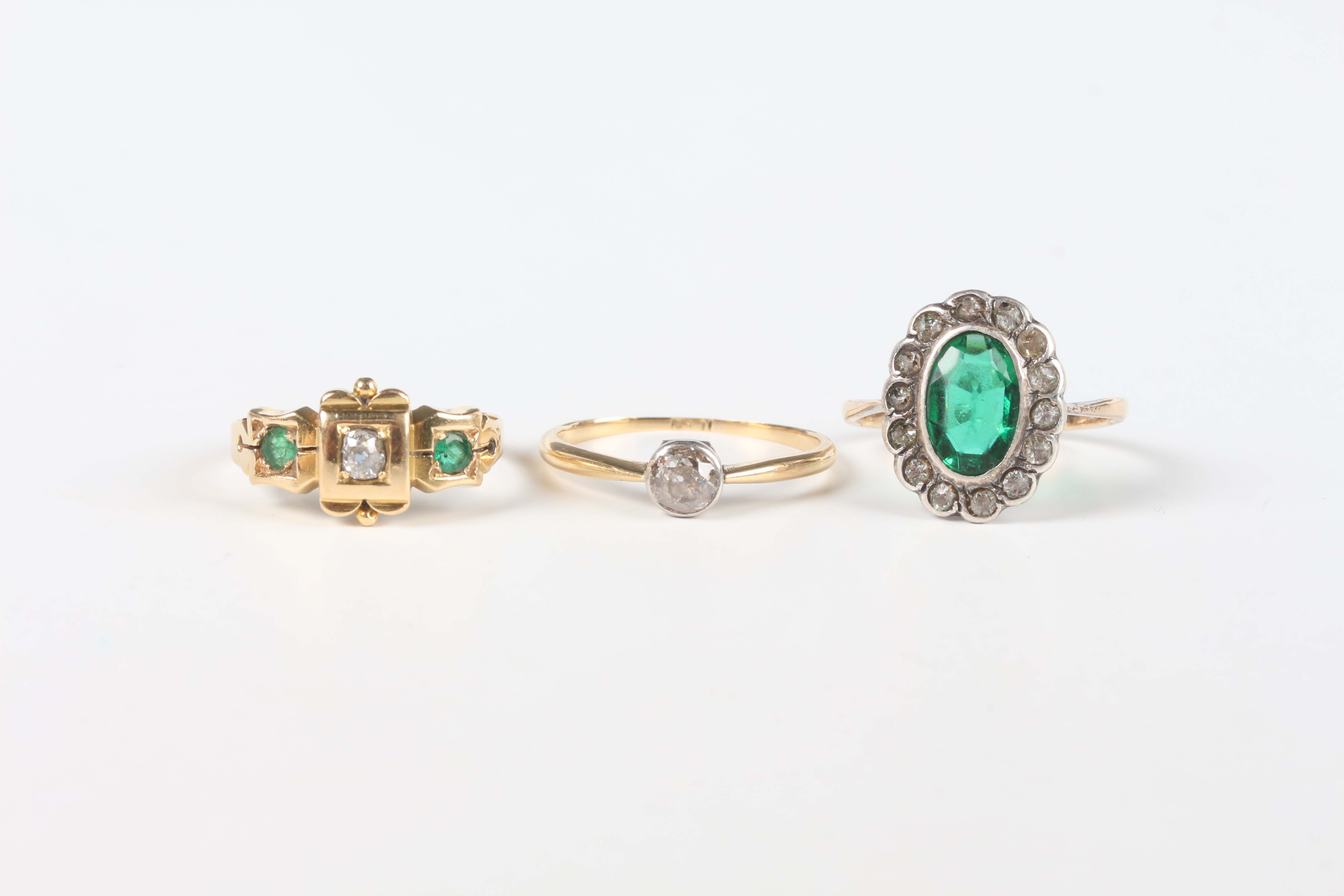 A gold ring, collet set with an old cut cushion shaped diamond, detailed '18ct', ring size approx L, an 18ct gold ring, mounted with a cushion shaped diamond and two circular cut emeralds, detailed ‘18’, ring size approx M, total weight 4.7g, and gold and silver set, green and colourless paste oval cluster ring, detailed ‘9ct&Sil’, weight 2.1g, ring size approx M.