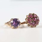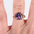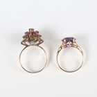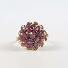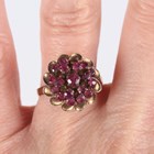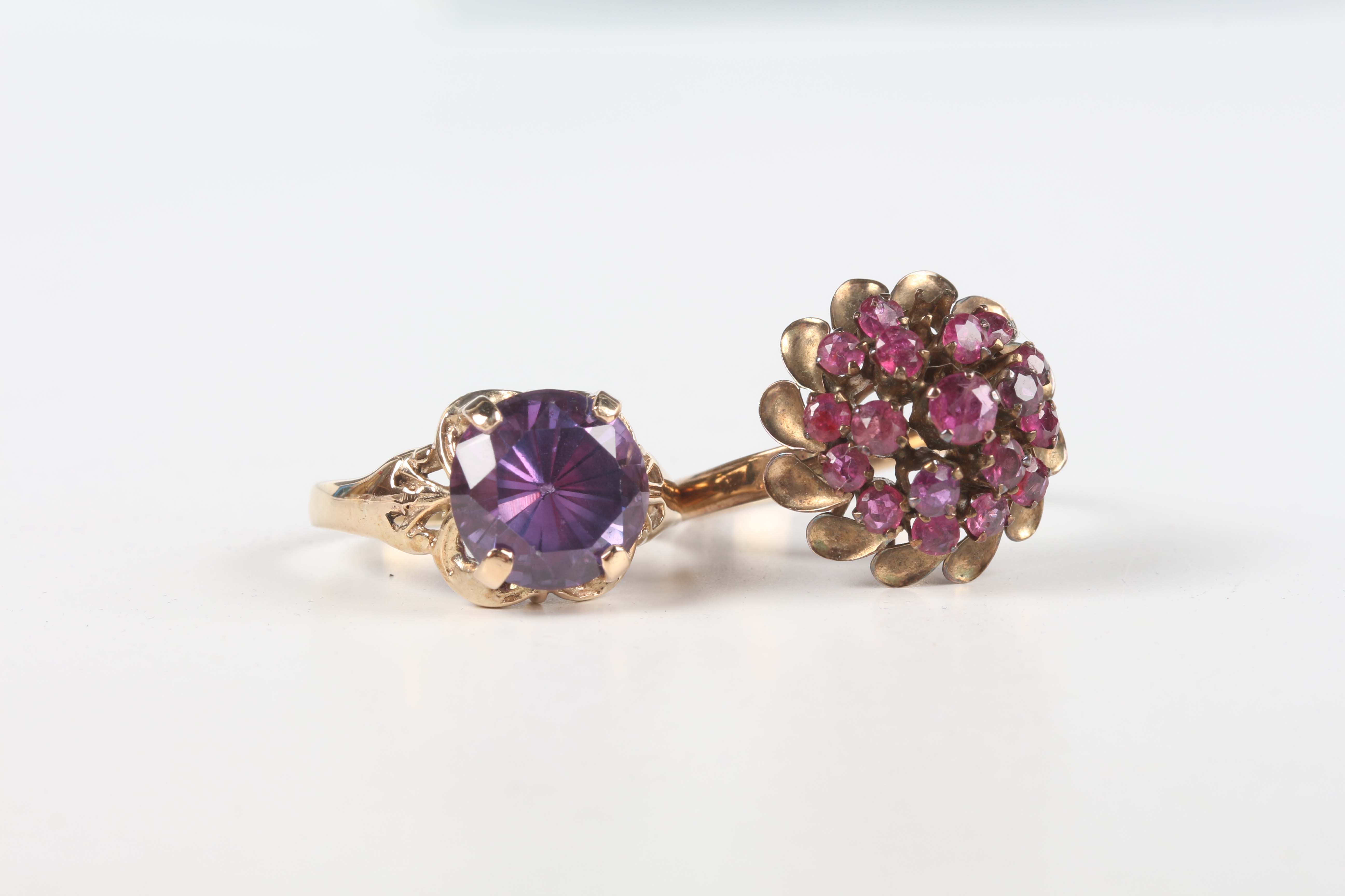 A gold and ruby cluster ring in a stylized flowerhead design, detailed ‘14K’, weight 3.1g, ring size approx Q1/2, and a gold ring, claw set with a circular cut synthetic corundum imitating alexandrite, detailed ‘9K’, weight 3.4g, ring size approx M1/2.