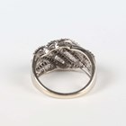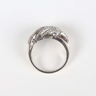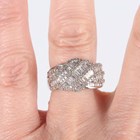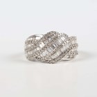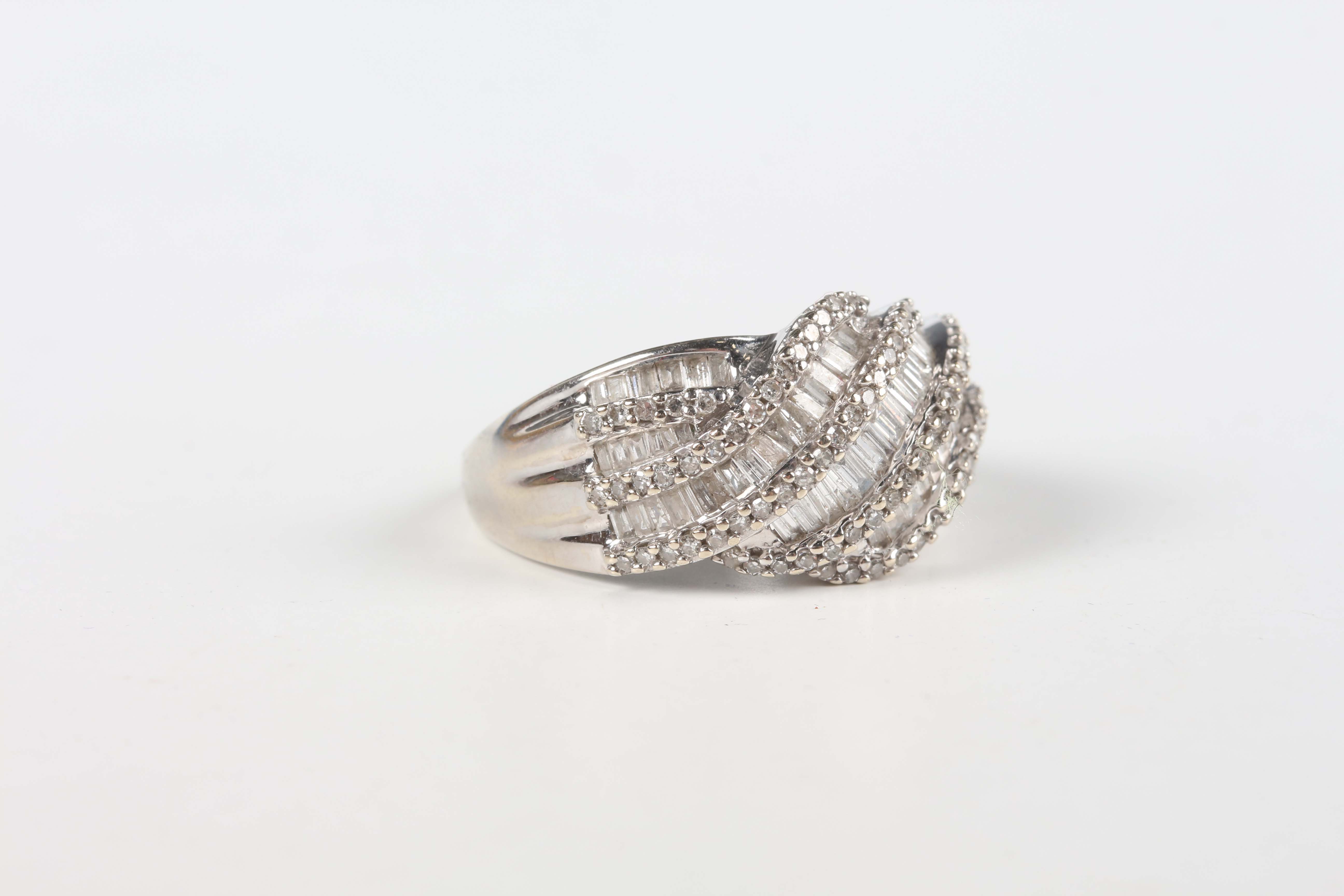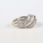 A white gold and diamond ring, mounted with baguette and circular cut diamonds in a twist design, detailed ‘14K’, weight 4.9g, ring size approx N1/2, cased.