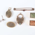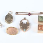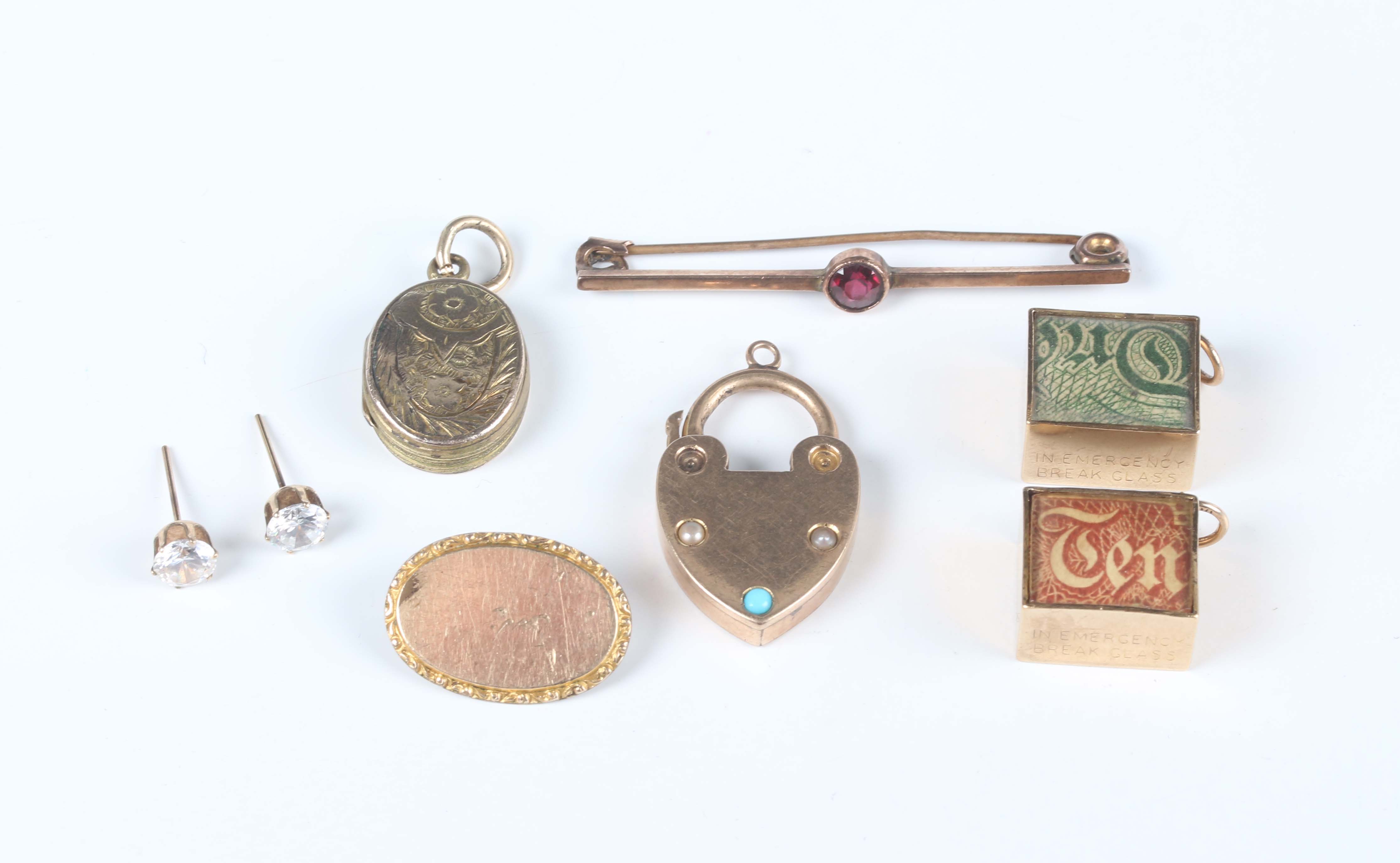 A gold and garnet single stone bar brooch, detailed ‘9ct’, a late Victorian 9ct gold half-pearl and turquoise set heart shaped padlock clasp, Birmingham 1899 (two gems lacking), a 9ct gold mounted one pound note charm, a 9ct gold mounted ten shillings note charm, total weight 13.3g, a Victorian oval small pendant locket, a pair of colourless gem set earstuds and a gilt metal brooch.