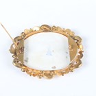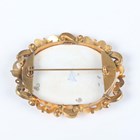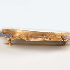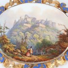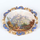 A mid-19th century gold and blue enamelled oval Meissen porcelain brooch, painted with a scene of a hilltop castle with figures in the foreground, possibly Albrechtsburg Castle, the mount with engraved scrollwork decoration alternating with blue enamelled 'S' scrolls, underglaze blue crossed swords to back, weight 42.8g, width 8cm.