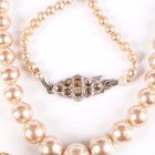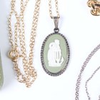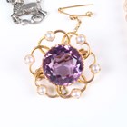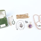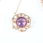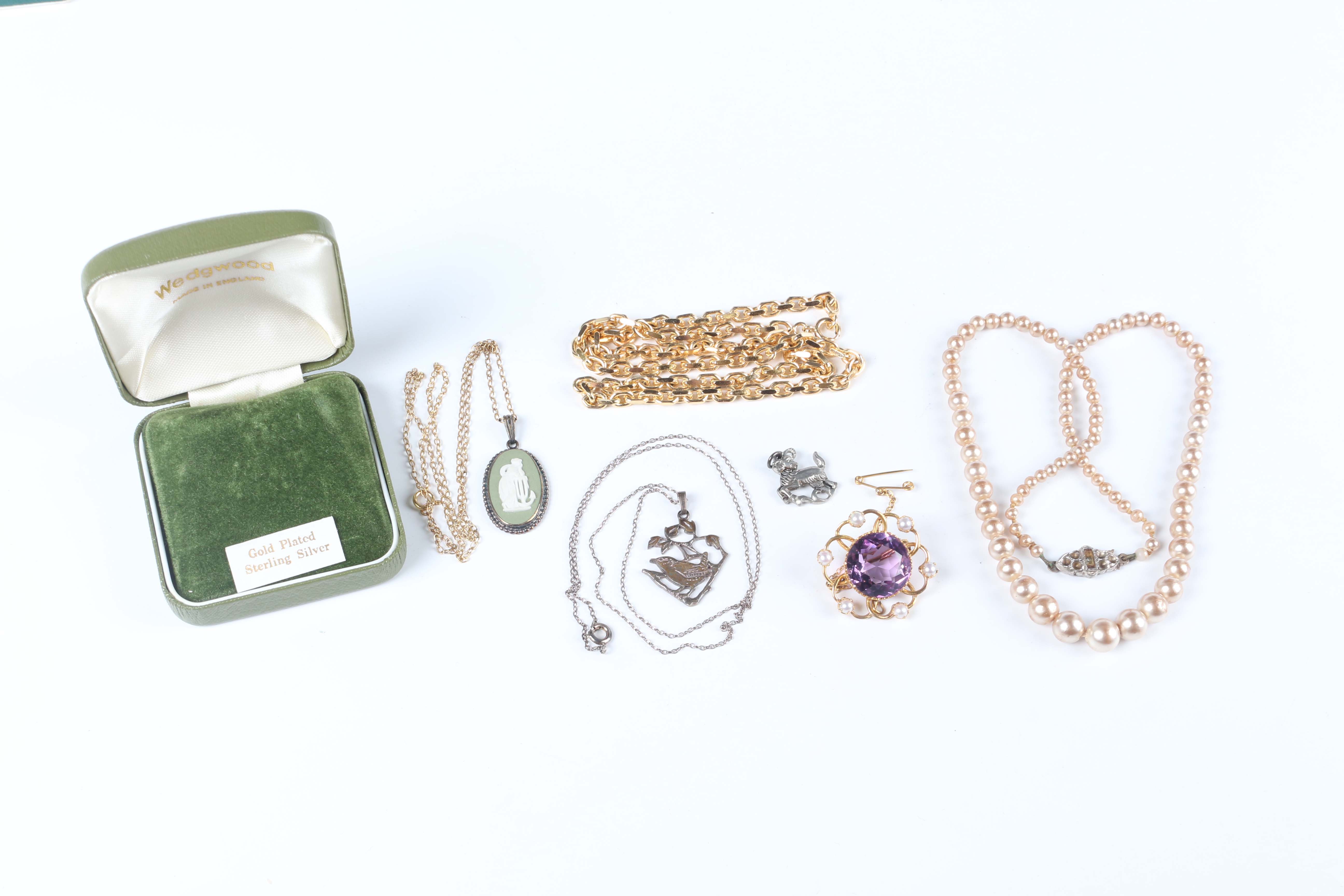 A 9ct gold, amethyst and pearl circular brooch, the central circular cut amethyst framed by entwined wirework, mounted with six pearls, weight 5.6g, diameter 2.8cm, together with two silver pendants, a silver neckchain, a sterling and Wedgwood green jasperware pendant with a gilt metal neckchain, cased, an imitation pearl necklace and a costume neckchain.
