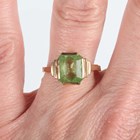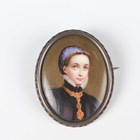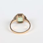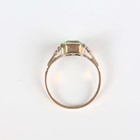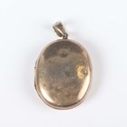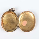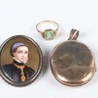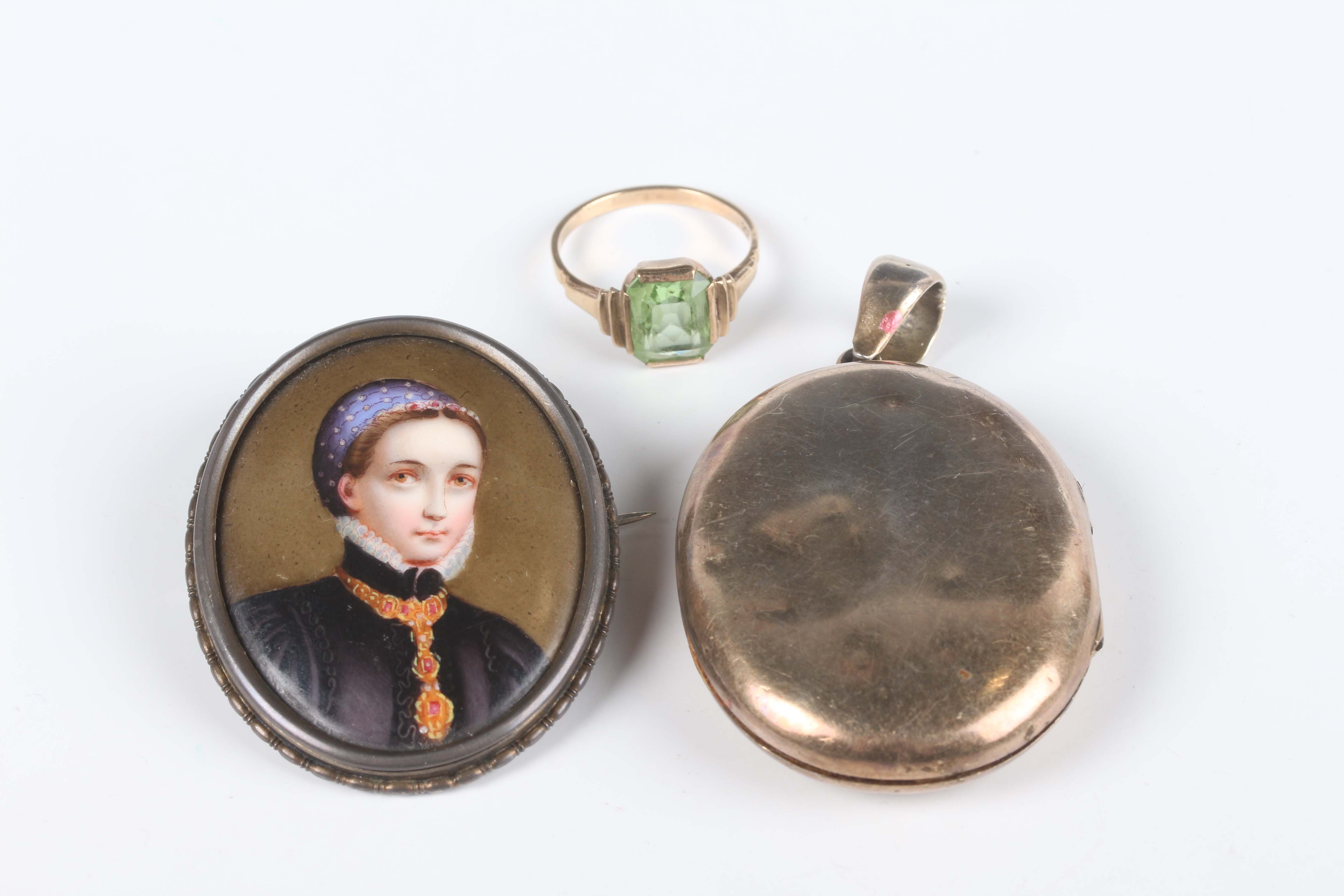 An Austo-Hungarian porcelain oval brooch, painted with a portrait miniature of a lady, a gold and pale green gem set solitaire ring, detailed '9ct', weight 2.4g, ring size approx P1/2, and a gilt oval pendant locket.