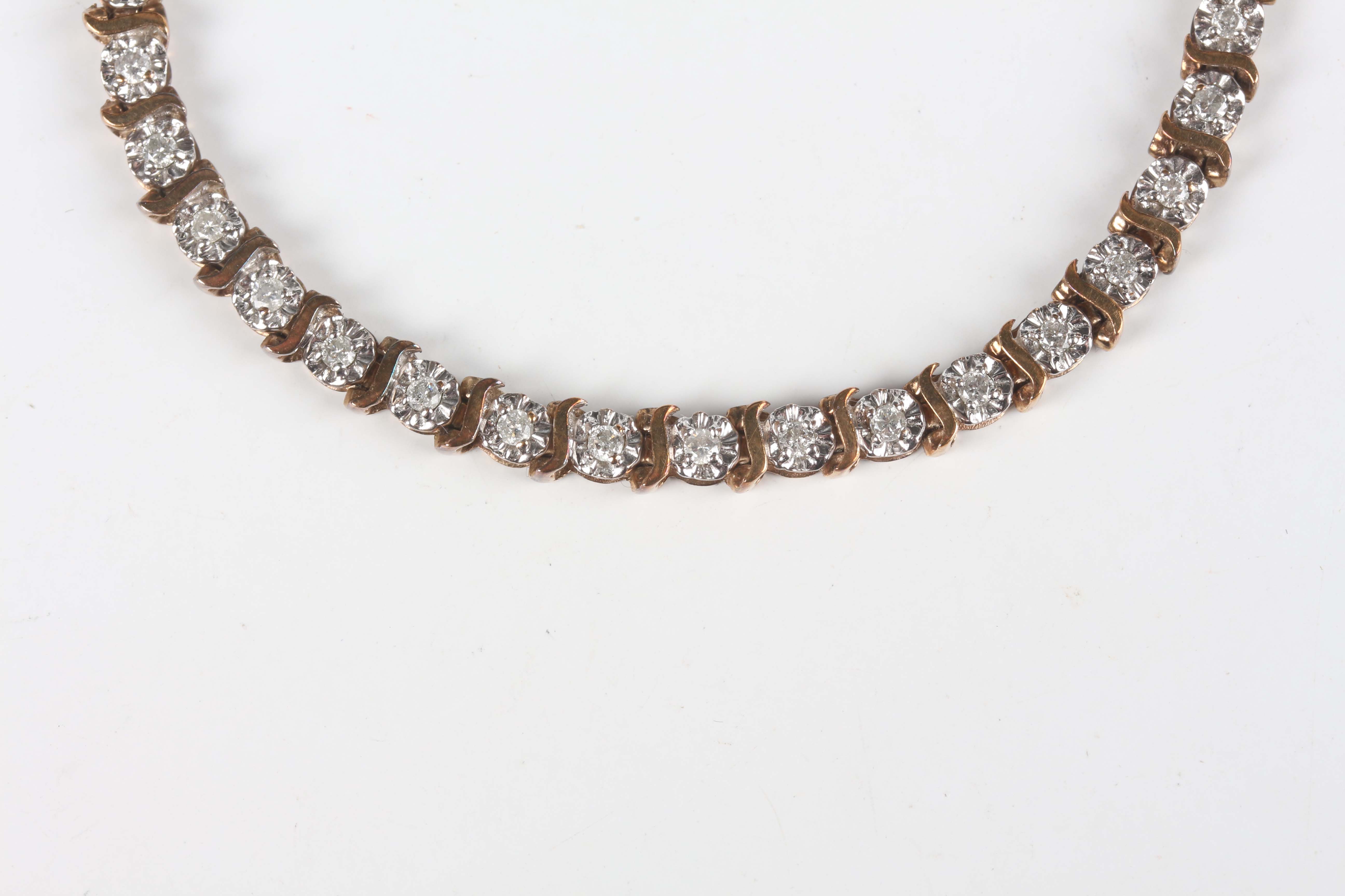 A 9ct gold and diamond bracelet, mounted with a row of circular cut diamonds within floral settings, alternating with 'S' shaped divisions, on a snap clasp, weight 8.4g, length 18cm.