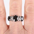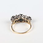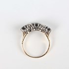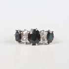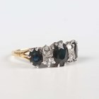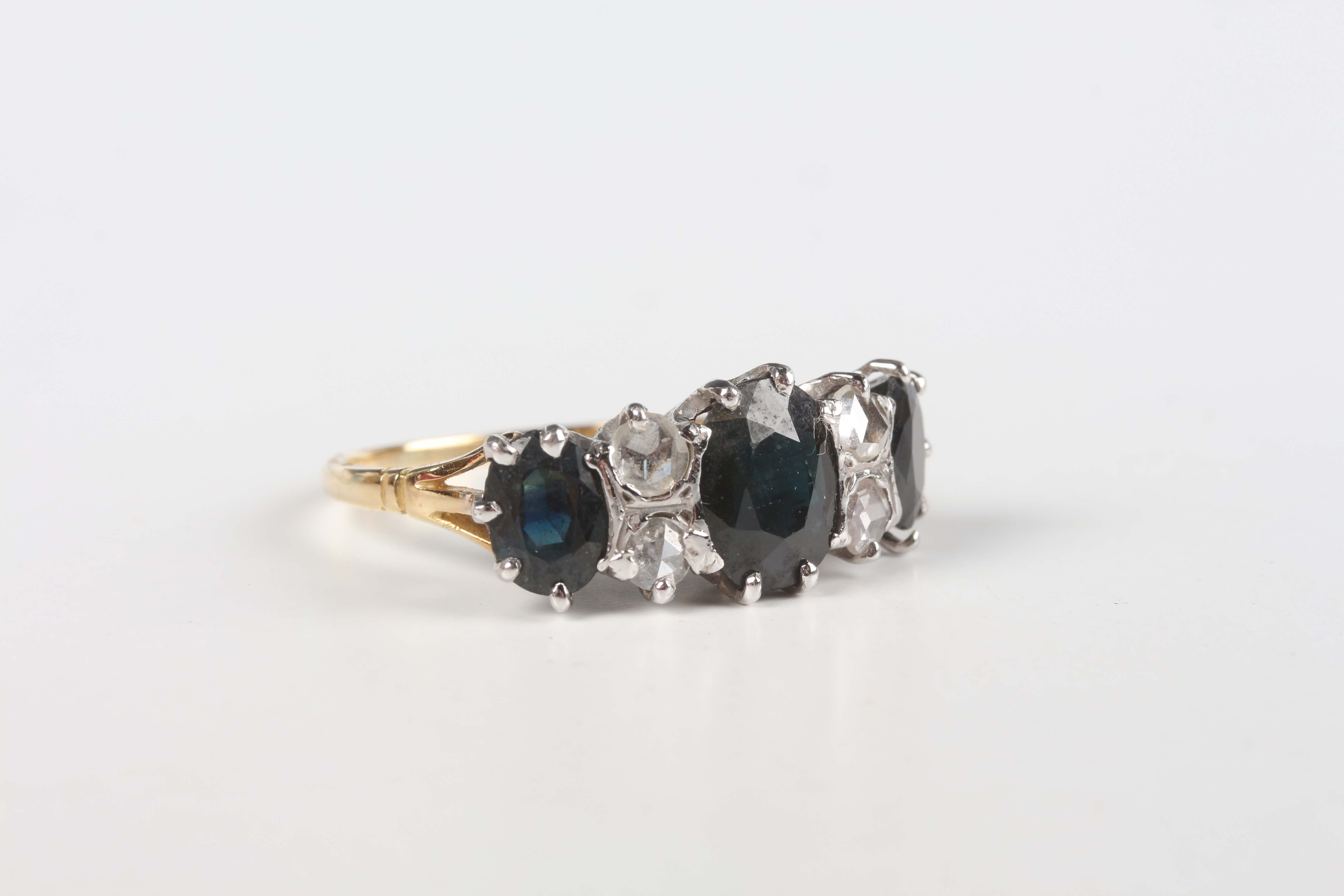 An 18ct gold, sapphire and diamond ring, claw set with three oval cut sapphires alternating with two pairs of rose cut diamonds, London 1973, weight 6g, ring size approx S1/2, with a case.