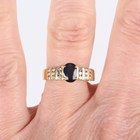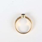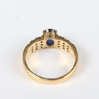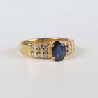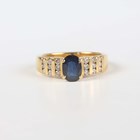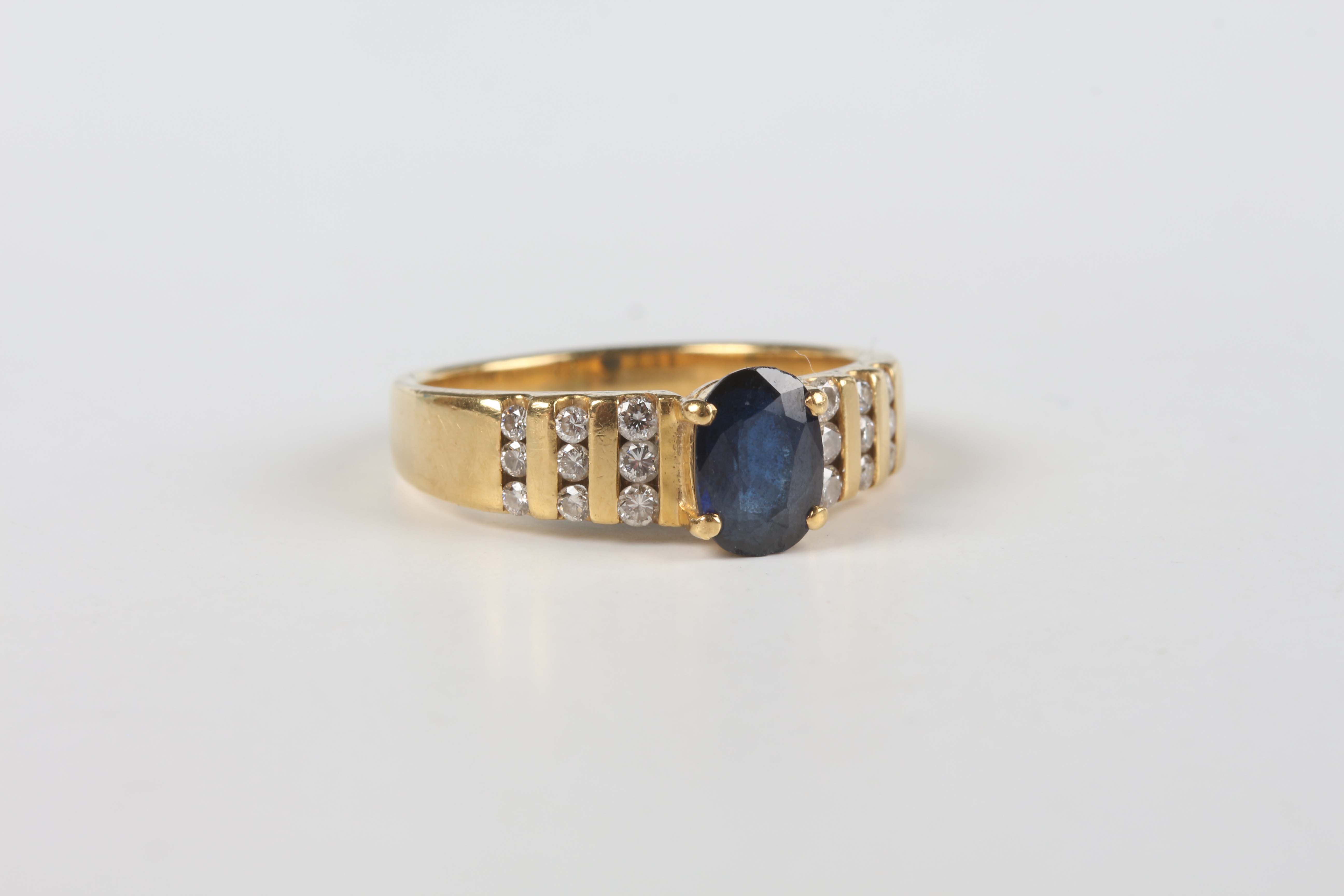 A gold, sapphire and diamond ring, claw set with the oval cut sapphire between diamond set shoulders, mounted with three rows of three circular cut diamonds, detailed ‘750’, weight 4.8g, ring size approx M1/2.