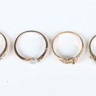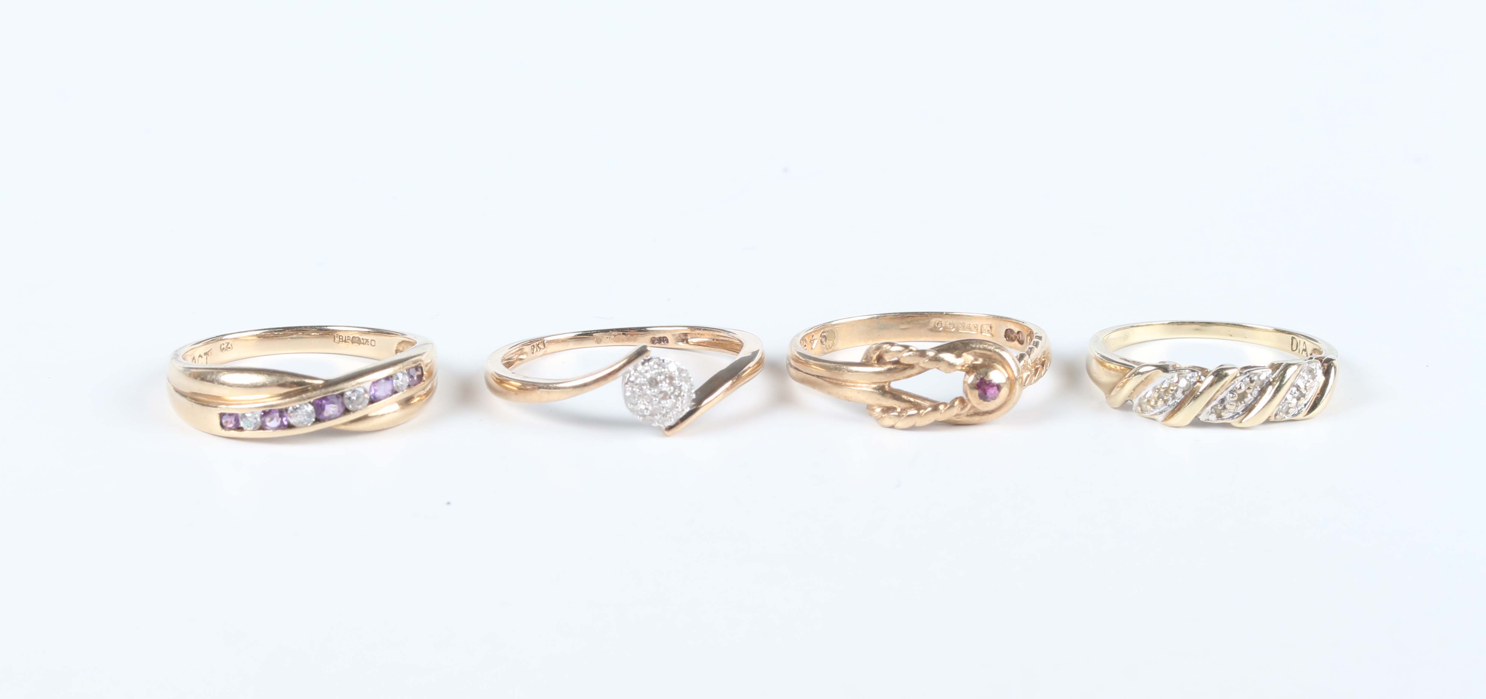 A 9ct gold, amethyst and colourless gem set ring in a twist design, ring size approx O, a 9ct gold and diamond cluster ring in a twistover design, ring size approx P1/2, a 9ct gold and ruby ring in a knot design, ring size approx N and a 9ct gold and diamond ring in a twist design, ring size approx L, total weight 7.7g.