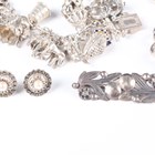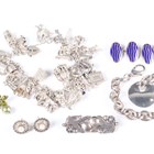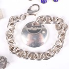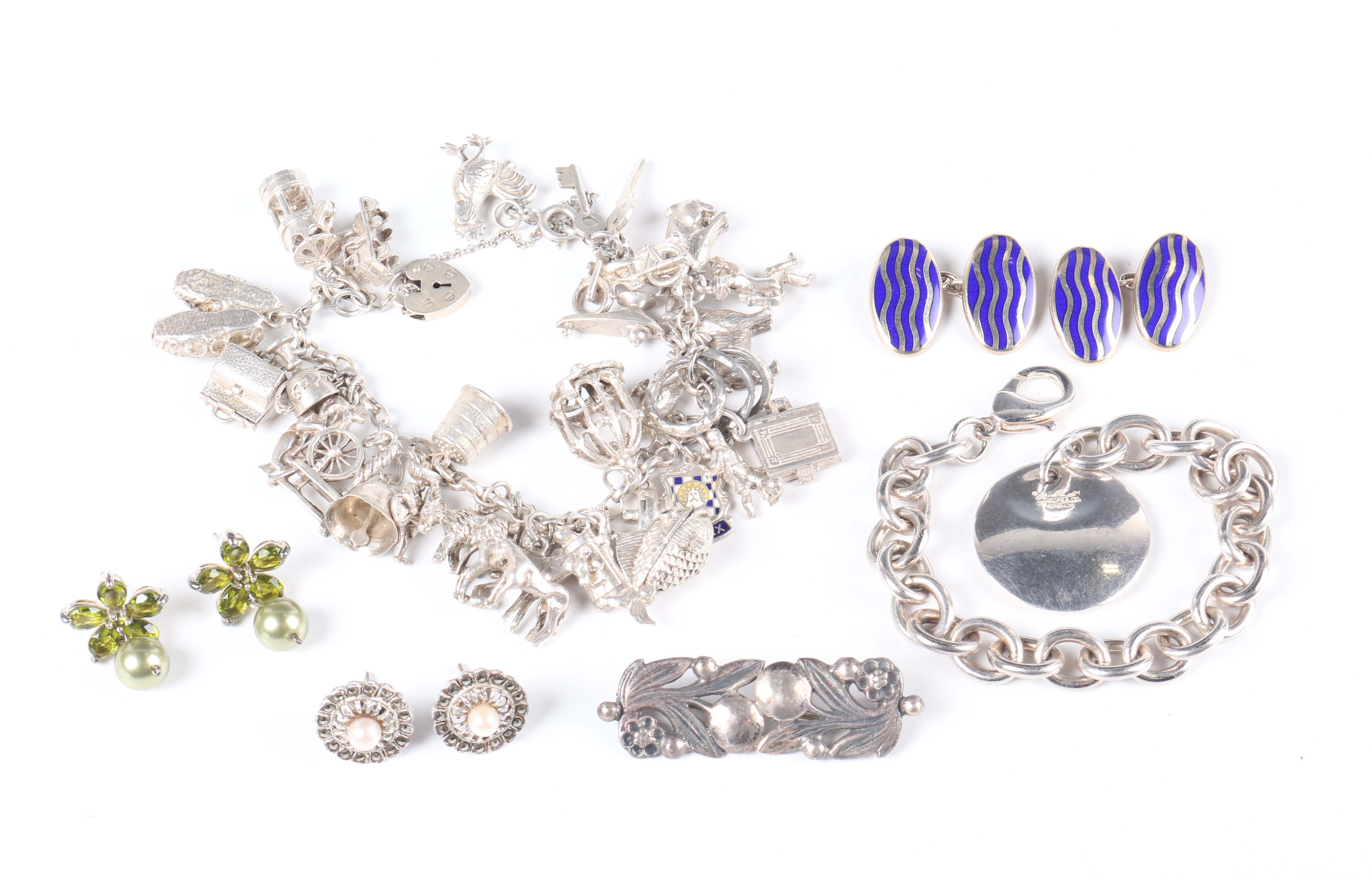 A group of mostly silver jewellery, comprising a charm bracelet, a brooch by Bernard Instone, a pair of silver gilt and blue enamelled oval cufflinks, an oval link bracelet, fitted with a pendant, detailed ‘Tiffany & Co Elsa Peretti 925 Spain’, length 20.5cm, and two pairs of earstuds.