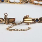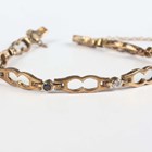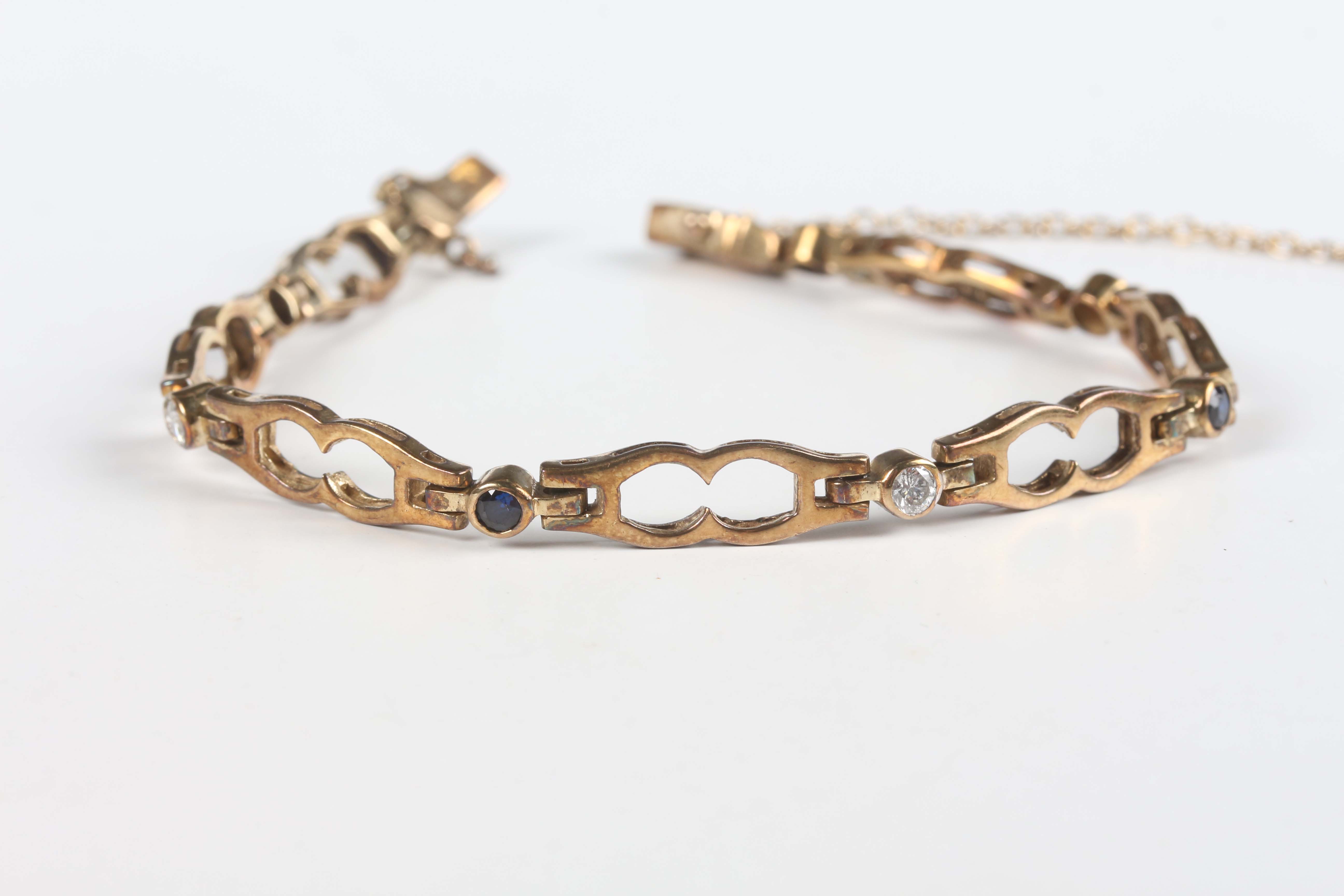 A 9ct gold, diamond and sapphire bracelet in a pierced shaped bar link design, collet set with three circular cut diamonds alternating and with four circular cut sapphires, on a snap clasp, fitted with a safety chain, weight 9.9g, length 18cm.